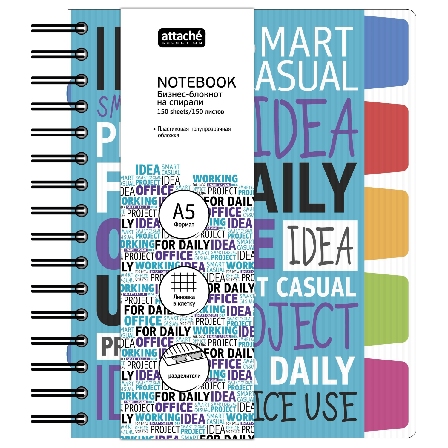 Бизнес-тетрадь Attache Selection Office Book 2 формата А5 с ярким офисныи дизайном, обложка из плотного рельефного прозрачного пластика, защищает бумагу от деформации. Цвет: голубой. Блок: скрепленный по вертикальному краю толстой черной евроспиралью, состоит из 150 листов, с микроперфорацией для аккуратного отрыва. Размер блока — 144×209 мм. Бумага высокой степени белизны разлинована в клетку, с полями. 5 съемных бумажных разделителей разбивают блок на тематические разделы, что очень удобно для ведения записей по нескольким предметам.