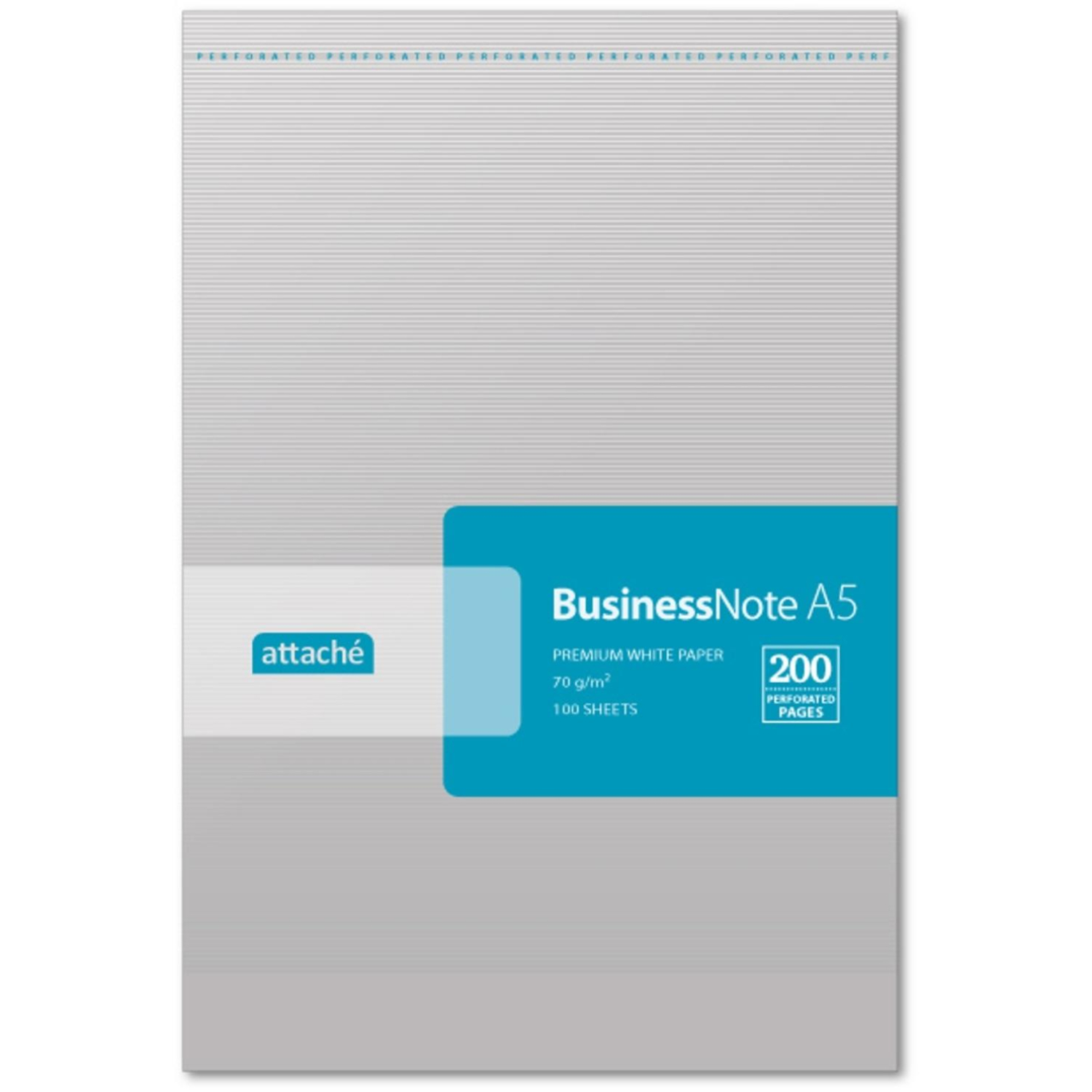 Блокнот Attache с перфорированным блоком серебристого цвета. Формат А5. Размер — 143×212 мм. Строгий, офисный дизайн с печатью серебром. Обложка выполнена из высококачественного мелованного картона с ламинацией. Плотность обложки — 200 г/кв.м. Подложка сделана из плотного картона. Блок 100% белизны с полями — офсетная бумага 70 г/кв.м с микроперфорацией и печатью насыщенным серым цветом. Размер блока — 143×210 мм. Тип крепления — склейка (также металлические скобки). Содержит в себе 100 листов (200 страниц) в линейку. Особенности: четыре отверстия для папок на кольцах, микроперфорация, печать, насыщенный серый цвет, упаковка в пленку. Необходимо придерживать лист в месте перфорации, чтобы он не вырвался полностью по спирали.