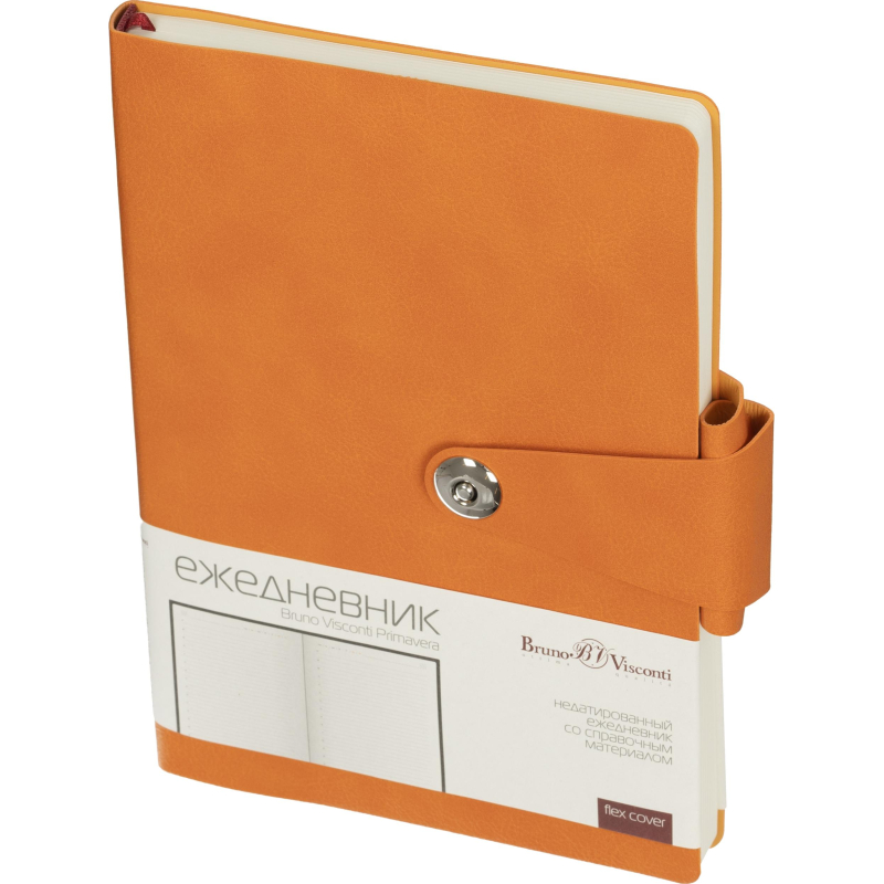 Ежедневник недатированный Bruno Visconti Primavera искусственная кожа А5 136 листов оранжевыйЕжедневник формата А5 из коллекции Primavera выполнен в насыщенном оранжевом цвете. Гибкая обложка из искусственной кожи надёжно фиксируется хлястиком на магнитной кнопке и дополнена петлёй для ручки. Скруглённые углы обложки и страниц защищают их от повреждений, придавая ежедневнику элегантный и долговечный вид.Ежедневник включает 136 страниц тонированной офсетной бумаги плотностью 90 г/кв.м. с линейкой. В начале ежедневника размещены страницы для личных данных и справочной информации, включая часовые пояса, телефонные коды, религиозные праздники, размеры одежды, термины международной торговли и другие полезные данные. Закладка-ляссе позволяет легко находить последние записи.Этот надёжный и качественный ежедневник идеально подойдёт для работы и путешествий, а также может быть персонализирован с добавлением логотипа или других элементов. Упакован в подарочную упаковку.