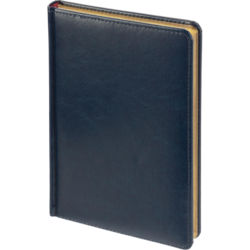 Ежедневник недатированный Attache Sidney Nebraska искусственная кожа А5 136 листов синий (золотистый обрез)Ежедневник с твёрдой обложкой из термоактивного материала синего цвета — идеальный выбор для делового человека. Обложка, выполненная из искусственной кожи, обладает красивым глянцем и насыщенным оттенком, а её поверхность подходит для различных видов тиснения, таких как блинт, фольга, конгрев, шёлкография и лазерная гравировка. Это позволяет персонализировать ежедневник, сделав его уникальным и стильным подарком.Внутренний блок состоит из 136 листов белой офсетной бумаги плотностью 90 г/кв.м. Листы разлинованы в линейку. Ежедневник дополнен золотистым обрезом и бордовым ляссе, что придаёт изделию дополнительный шарм. Размер блокнота — А5 (145×205 мм), он имеет удобную вертикальную ориентацию и скруглённые углы. Печать блока выполнена в два цвета, что придаёт дополнительную эстетику.Кроме того, в ежедневнике предусмотрена справочная информация на 7 листах (14 страниц), включающая данные о часовых поясах, аэропортах Европы, штрих-кодах, международных праздниках, а также полезную информацию по единицам измерения и кодам стран и городов.Этот ежедневник подойдёт для ежедневных записей и станет практичным и стильным аксессуаром для любого профессионала.