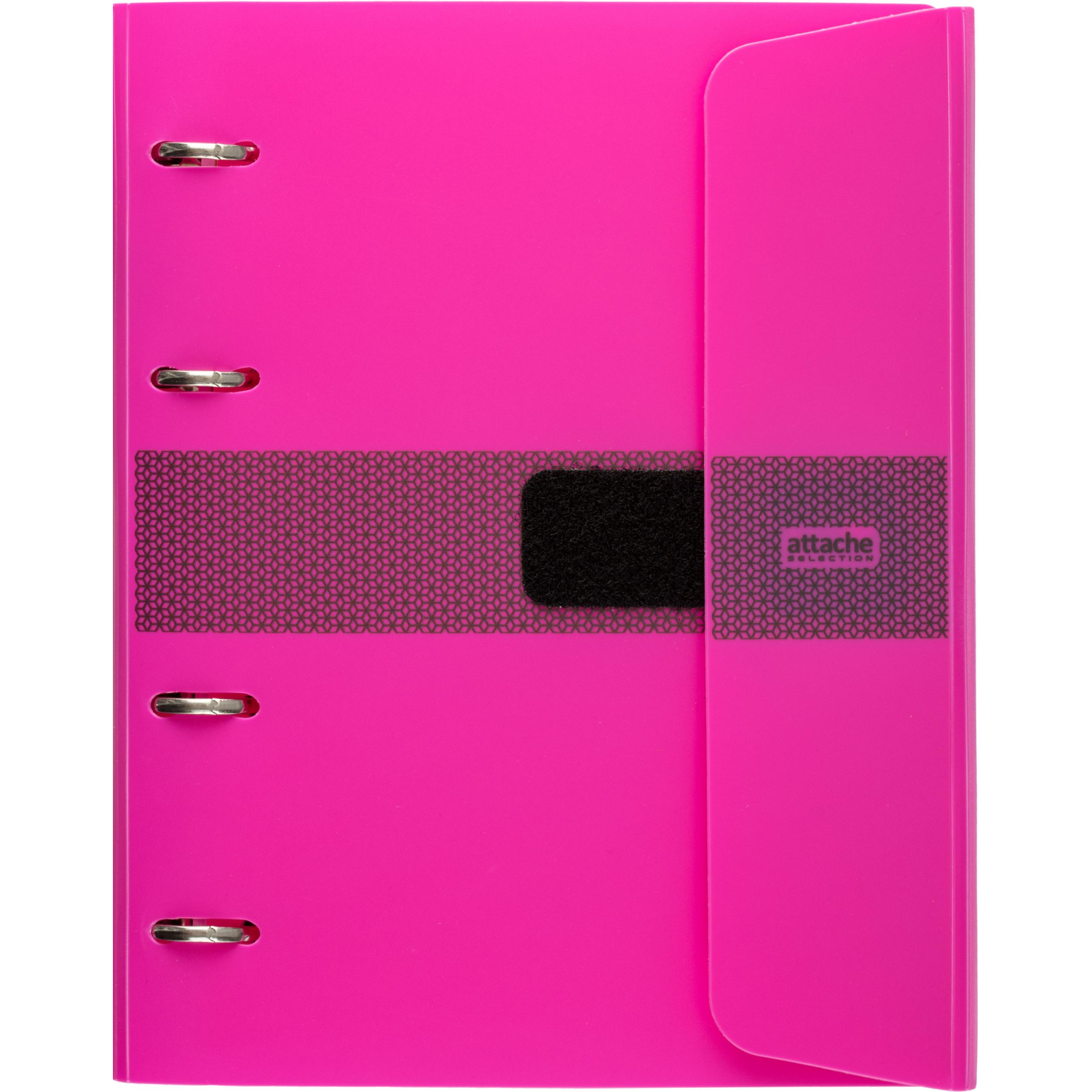 Бизнес-тетрадь Attache Selection A5 120 листов розовая в клеткуТетрадь формата А5 со сменным блоком состоит из 120 листов белой офсетной бумаги, разлинованных в клетку с полями. Листы имеют размер 14.7×20.3 см и плотность 65 г/кв.м. Блок крепится с помощью кольцевого механизма, расположенного слева, и не имеет перфорации. Линовка серого цвета помогает удобно записывать информацию.Обложка выполнена из яркого розового пластика с лаконичным узором. Обложка мягкая и надёжно фиксируется в закрытом виде с помощью липучки и прорезей для колец. В комплекте идёт резинка для крепления пишущих принадлежностей.