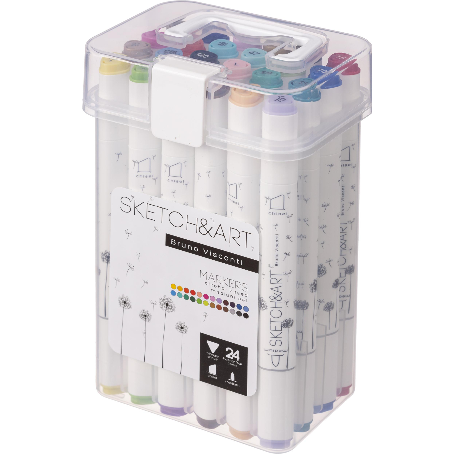 Набор маркеров для скетчинга Sketch&Art Medium set двухсторонние 24 цвета (толщина линии 1-5 мм) Великолепный базовый набор из 24 скетч-маркеров Sketch&Art в удобном пластиковом пенале. Начните знакомство с техникой скетчинга с основных цветов и расширяйте возможности вашего рисунка за счёт дополнительных оттенков. Необычные скетч-маркеры из серии Sketch&Art имеют эргономичную треугольную форму и дизайнерский рисунок на корпусе. Два классических наконечника: пулевидный (от 1 мм) и клиновидный (5 мм). Большой запас чернил на спиртовой основе со сроком хранения 4 года. Идеально прилегающие колпачки обеспечивают долгий срок службы. Маркеры необходимо хранить закрытыми. Используйте бумагу разной гладкости и плотности для создания эффектных рисунков. Чем более гладкая бумага, тем больше появляется возможностей для быстрого смешения цветов и создания градиентов Можно нанести рисунок на стекло или светлый пластик, предварительно обезжирив поверхность. Полученный результат будет стойким и ярким. Экспериментируйте с поверхностями и форматами. В случае попадания скетч-маркера на кожу или одежду, следы можно удалить с помощью моющего средства. Цвета в наборе: сине-зелёный, пастельно-розовый, лавандовый, зелёный, коричневый, фиолетовый, ярко-фиолетовый, кирпичный, голубой, синий, светло-серый, светло-коричневый, зелёный, болотный, ярко-жёлтый, карминовый, розовый, серый, красный, ярко-голубой, нежно-голубой, чёрный, коричневый, нежно-розовый.