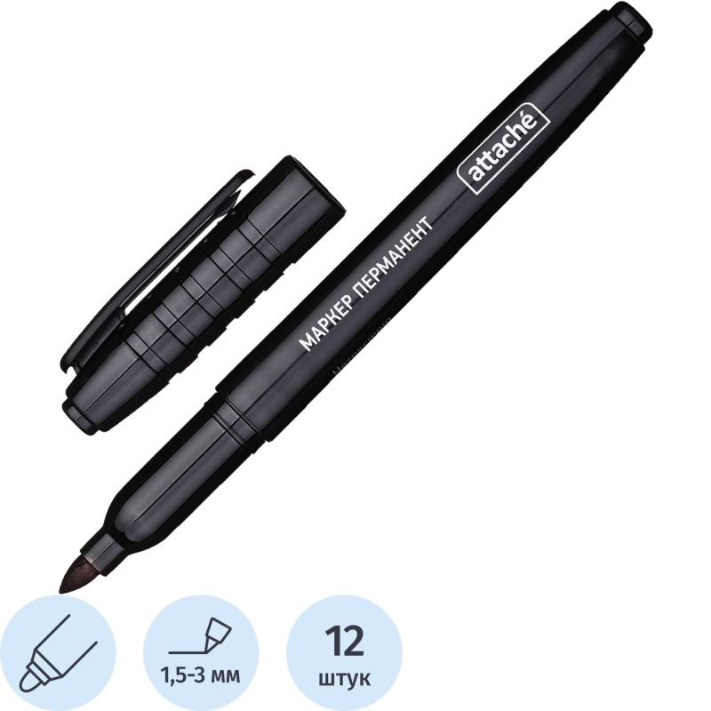 Маркер перманентный Attache чёрный круглый наконечник (толщина линии 1.5-3 мм, 12 штук в упаковке)Перманентный маркер идеально подходит для различных поверхностей. С его помощью можно маркировать пластик, дерево, металл, стекло и картон. Чёрные водостойкие чернила на спиртовой основе быстро сохнут и стойки к воздействию воды, ультрафиолета и температурных изменений.Этот маркер оснащён эластичным круглым фетровым наконечником, который отличается высокой износостойкостью, что обеспечивает экономный расход чернил. Наконечник не высыхает благодаря плотному колпачку, который предотвращает испарение чернил. Угол наклона наконечника позволяет регулировать толщину линии, что делает маркер удобным для разных типов нанесения.Маркер имеет удобный пластиковый корпус круглой формы и снабжён клипом на колпачке для удобства хранения и транспортировки. В упаковке содержится 12 маркеров, каждый из которых поставляется в картонной коробке.Этот перманентный маркер станет незаменимым инструментом для любого рабочего процесса, требующего стойких и чётких меток.