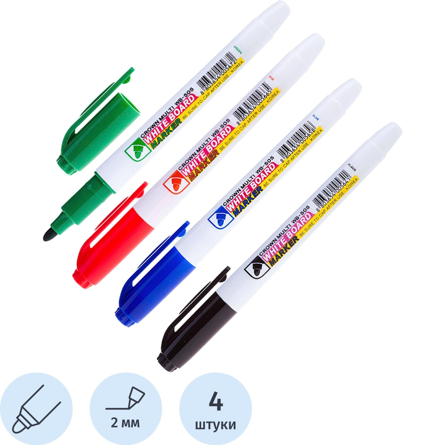 Набор маркеров Crown Multi Board Slim предназначен для использования на досках с магнитно—маркерной и на других непористых поверхностях (стекло, фарфор, пленка и пр.).Тонкий корпус удобно лежит в руке у ребенка. Благодаря особому строению пишущего узла чернила дозированно поступают на поверхность, не вытекают из наконечника и не образуют клякс. Чернила на спиртовой основе высыхают на поверхности доски в течении 1–2 секунд. Маркер до 2 дней не высыхает без колпачка, а при закрытом колпачке в течении одного часа полностью восстанавливает свои свойства!Прочный фибровый наконечник не западает в корпус и сохраняет форму на протяжении всего срока службы маркера. След от маркера легко удаляется сухой губкой. Пулевидный наконечник позволяет наносить яркие и однородные линии толщиной 2 мм. Количество в наборе: 4 цвета. Цвет чернил — зеленый, синий, черный, красный.Внимание! Маркеры для досок необходимо хранить в горизонтальном положении или фетром вниз.