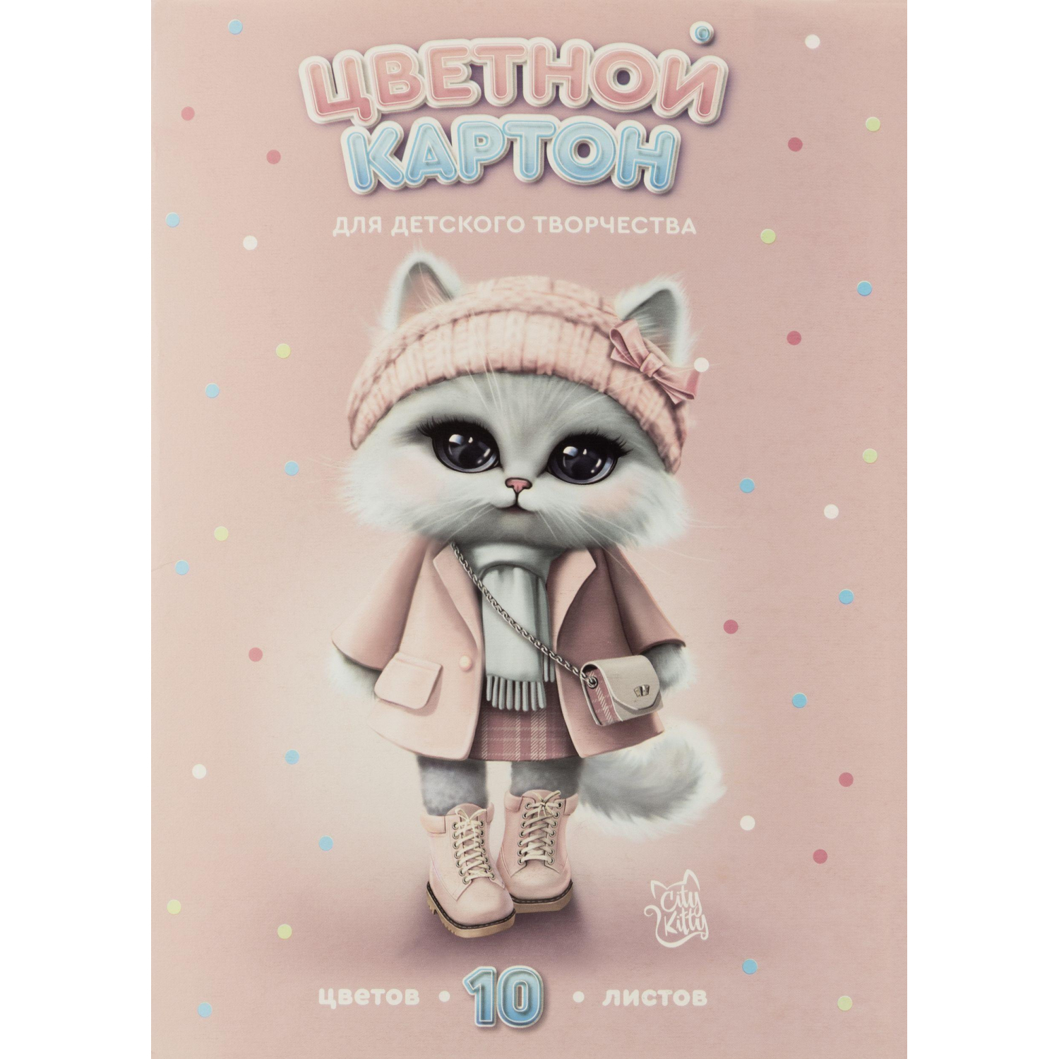 Картон цветной Кошечка (А4, 10 листов, 10 цветов, мелованный, разноцветный)Цветной картон предназначен для детского творчества, аппликаций и различных поделок. Подходит для работы в детских садах, школах и для домашнего использования.В набор входит 10 листов мелованного картона формата А4. Листы окрашены в 10 различных цветов, при этом одна сторона каждого листа имеет декоративные элементы золота и серебра. Обратная сторона — серая. Плотность картона — 230 г/кв.м, что делает его удобным для вырезания и создания объемных композиций.Листы упакованы в папку с клапанами. Обложка выполнена из мелованного картона с полноцветной печатью и серым оборотом.