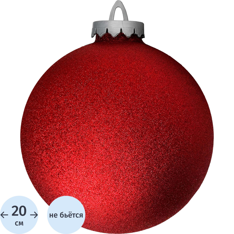 Ёлочный шар новогодний BigDecor пластик красный (диаметр 20 см)Яркий, блестящий ёлочный шар диаметром 20 см, красный с глиттером. Предназначен для оформления уличных и интерьерных елей, а так же для придания праздничного настроения витринам магазинов и общественным зонам.Не смотря на большие размеры, шары BigDecor обладают малым весом, что позволяет их крепить на любой конструкции с помощью лент, лески или декоративных шнурков. Шары выполнены из ударопрочного материала, что позволяет им не разбиваться при падении. Глиттер надёжно нанесён на изделии, шар не осыпается и не теряет свой товарный вид. Шар имеет плотно закручивающийся колпачок, с ушком для удобства крепления.Шары выполнены из вторично-перерабатываемого материала.