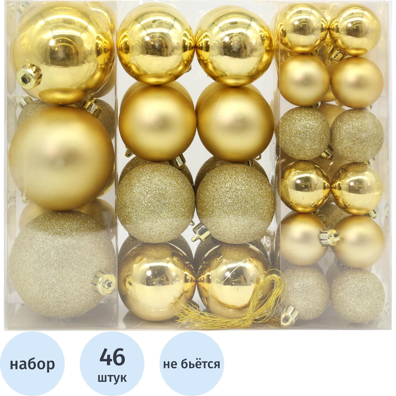 Набор шаров ёлочных Magic Time полистирол золотистые (24 шара диаметр 4 см, 16 шаров диаметр 6 см, 6 шаров диаметр 8 см)Золотистые, выполненные из полистирола, станет отличным украшением для вашего рождественского дерева. В набор входит 46 шаров разных диаметров: 24 шара диаметром 4 см, 16 шаров диаметром 6 см и 6 шаров диаметром 8 см. Эти игрушки будут гармонично смотреться на фоне хвои, создавая атмосферу праздника и радости. Глянцевая поверхность и блёстки на шарах будут переливаться в свете гирлянд, привлекая внимание и наполняя ваш дом атмосферой волшебства.Шарики выполнены из прочного полистирола, что делает их безопасными в использовании, даже если в доме есть дети или питомцы, так как они не разобьются. В комплекте предусмотрены петельки для подвешивания, а также удобная подарочная упаковка для хранения и транспортировки.