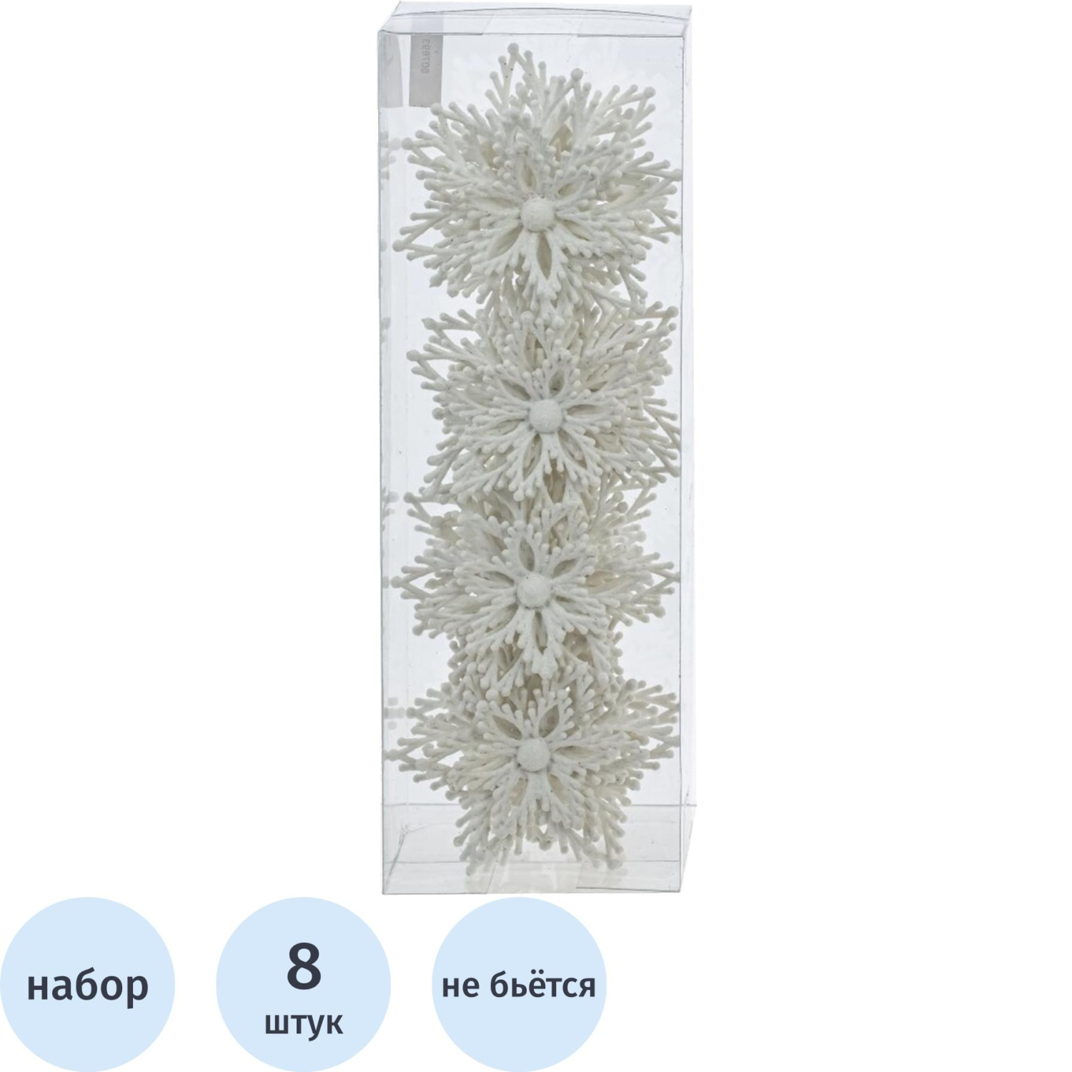 Набор украшений новогодних Снежинка пластик (диаметр 8 см, 8 штук в упаковке) Набор из 8 объёмных снежинок в белом цвете с искрящимся глиттером — идеальное украшение для вашей новогодней ёлки. Эти снежинки создадут атмосферу зимней сказки и гармонично впишутся в любую декоративную концепцию. Изящный дизайн делает их уникальным декором, который будет прекрасно смотреться на ёлке, добавляя ей роскоши и сверкающего блеска. Подарите себе и близким частичку волшебства с этим красивым набором! Поставляются в прозрачной пластиковой упаковке.Размер упаковки: 28×6x9,5 см.