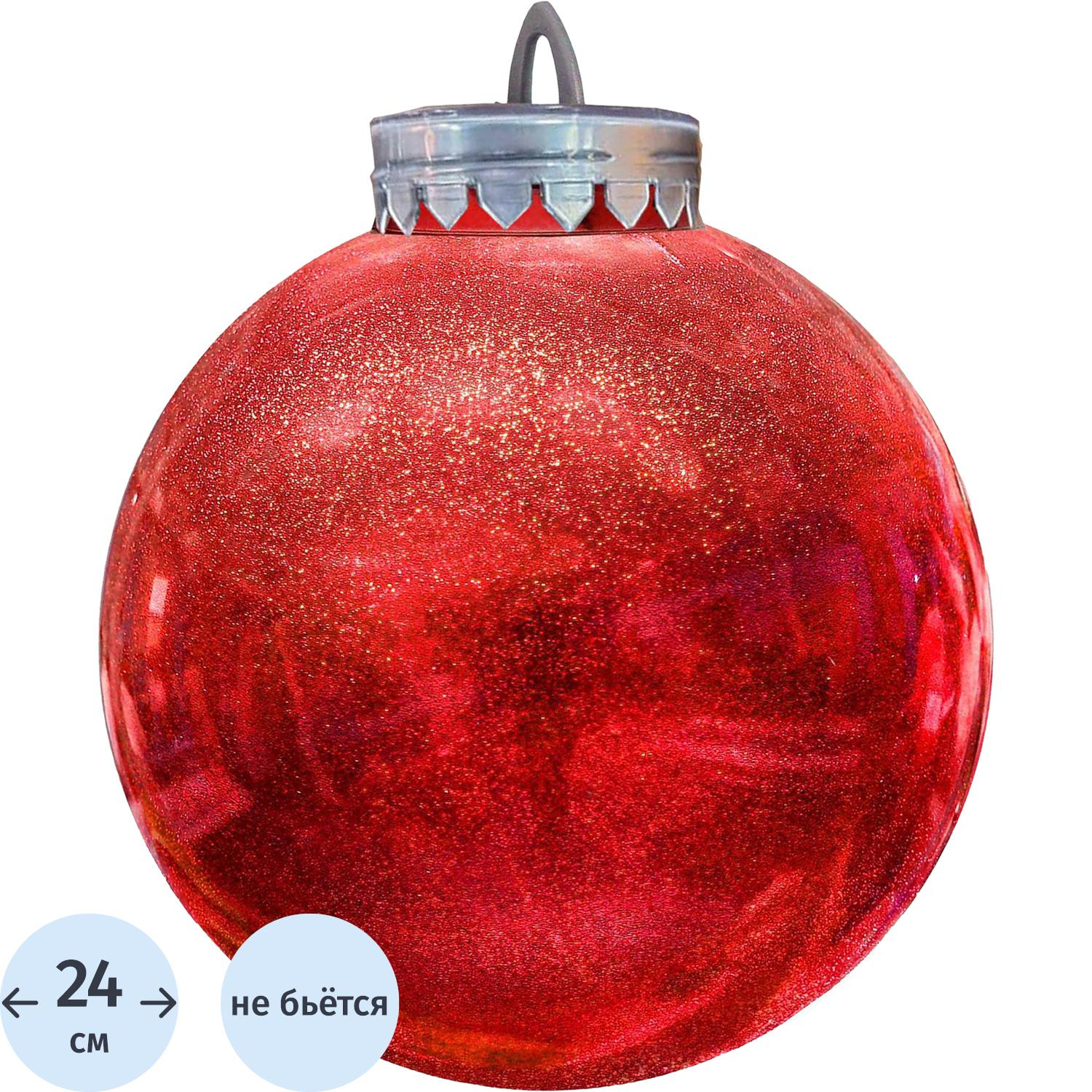 Ёлочный шар новогодний BigDecor пластик красный (диаметр 24 см, 513434)Новогодний шар из пластика красного цвета диаметром 24 см — идеальный элемент для украшения новогодней ёлки. Блестящее покрытие шара будет сверкать и переливаться в свете огней гирлянд, создавая яркую и праздничную атмосферу. Этот большой шар прекрасно подходит для украшения высотных ёлок, добавляя яркие акценты в ваш новогодний декор. Благодаря высококачественному пластику, шар не разобьётся при случайном падении, а его прочное покрытие гарантирует долговечность. Шар крепится с помощью подвеса, что делает его удобным для размещения на ветках. Он будет гармонично сочетаться с любым праздничным убранством и создаст атмосферу волшебного праздника.