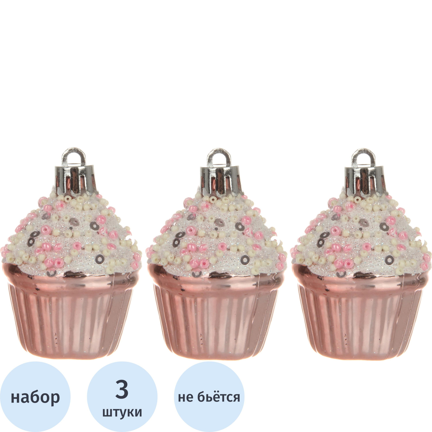 Набор ёлочных игрушек Весёлый хоровод Кексики пластик (высота 5.5 см, 3 штуки в упаковке)Набор ёлочных игрушек включает 3 фигурки в виде кексов, выполненных из пластика и высотой 5.5 см. Эти аппетитные кексы, украшенные пайетками, будут красиво блестеть под светом гирлянд, создавая атмосферу праздника и волшебства. Розовый цвет фигурок придаст вашему новогоднему дереву особый, яркий акцент.Игрушки поставляются в коробке, что делает их отличным подарком для коллег и друзей. Выполненные из прочного пластика, кексы не разобьются при случайном падении, что позволяет использовать их в домах с детьми. Эти украшения добавят яркости вашей ёлке и привлекут внимание гостей. Фигурки не подходят для украшения высотных ёлок, но идеально подойдут для стандартных размеров деревьев.