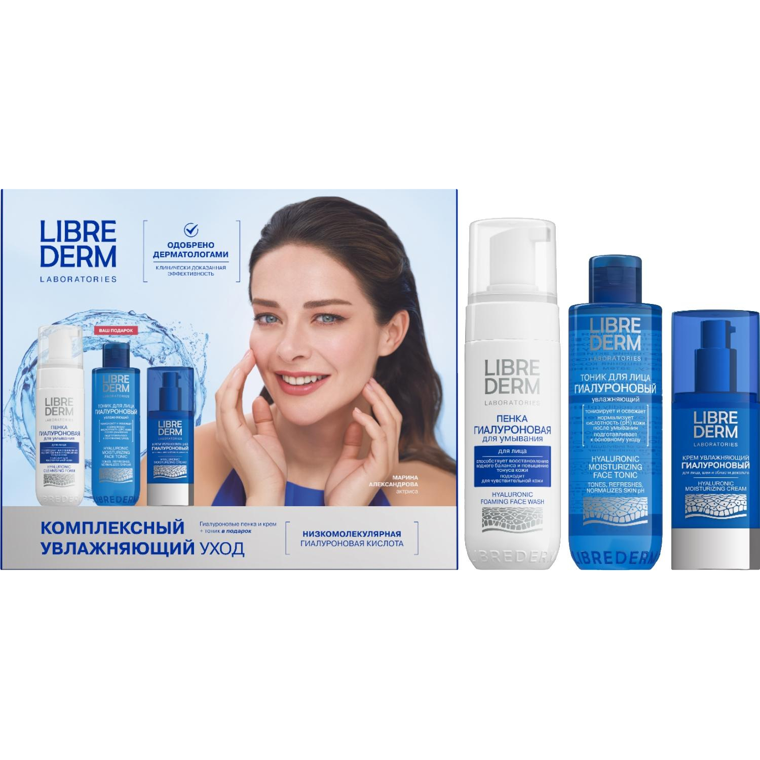 Подарочный набор косметики для женщин Librederm Гиалуроновый уходНабор Гиалуроновый уход 3=2 «Три шага к увлажнённой коже».Гиалуроновая коллекция — стандарт увлажнения кожи. Регулярное увлажнение кожи на всех её уровнях в любом возрасте помогает отсрочить появление возраст-ассоциированных изменений, а также значительно снизить их выраженность.В состав набора входят.Librederm гиалуроновая пенка для умывания, 160 мл. Бережное и тщательное очищение кожи лица от загрязнений и макияжа без ощущения плёнки.Librederm гиалуроновый тоник для лица увлажняющий, 200 мл. Увлажняющий тоник бережно устраняет с поверхности кожи остатки очищающего средства, восстанавливает ph баланс кожи.Librederm гиалуроновый крем увлажняющий для лица, шеи и области декольте, 50 мл. Увлажняющий крем на основе низкомолекулярной гиалуроновой кислоты обеспечивает продолжительное увлажнение, устраняет чувство стянутости, улучшает микроциркуляцию, делает кожу сияющей и гладкой, придавая ей здоровый вид. Предотвращает появление морщин и шелушение, вызванные обезвоженностью.