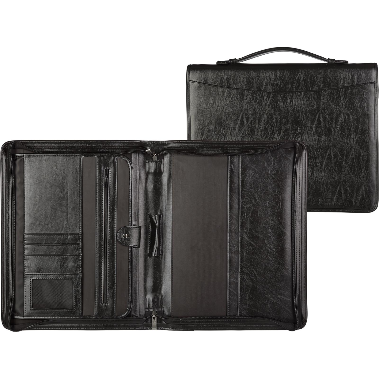Папка из кож/зам № 161. Материал — искусственная кожа. Закрывается на молнию. Удобная ручка позволяет носить папку, как портфель. Внутри папки есть оригинальное откидное отделение с карманами для мелких документов и визиток, которое крепится с помощью кнопки. Размеры: 35×27.7 см. Толщина папки: 5 см.