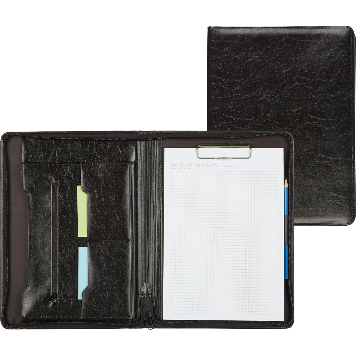 Обновленный вариант папки Лидер. Материал — искусственная кожа. Закрывается на молнию. Объемный карман для документов, дополнительные карманы для документов разного формата. Металлический прижим для бумаг. Комплектуется отрывным блоком для записей формата А4. Размеры: 34×22 см. В комплекте к данной папке не прилагается пишущая ручка.