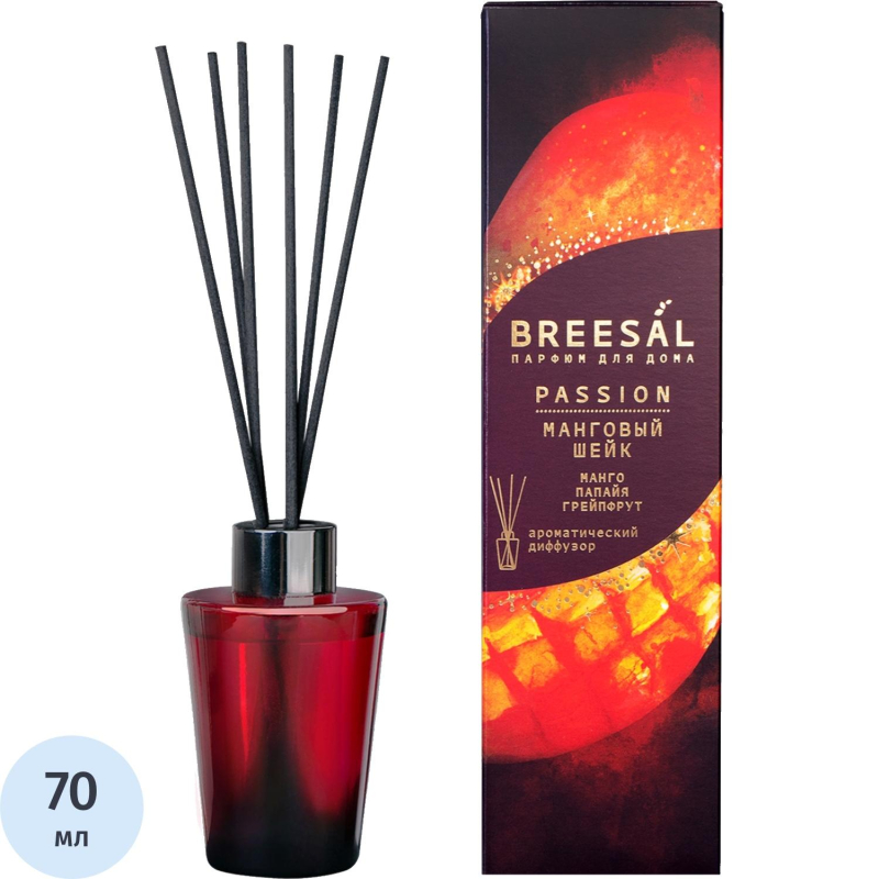 Аромадиффузор Breesal Passion Манговый шейк 70 млПогрузитесь в мир романтики, страсти и удовольствия с ароматическими диффузорами линейки Passion! Каждый аромат — это истинное путешествие в мир гурманских наслаждений, созданных для того, чтобы пробудить в вас эмоции и воспоминания.Создайте атмосферу тропического рая с аромадиффузором «Манговый шейк» — вашим личным оазисом свежести и экзотики прямо у вас дома. Нежные ноты спелого манго, сочной папайи и яркого грейпфрута создают неповторимый букет, наполненный радостью и энергией тропиков. Объём флакона — 70 мл.Фруктовая группа ароматов дарит ноты теплоты и сладости, словно вы наслаждаетесь свежевыжатым фруктовым коктейлем на пляже. Папайя добавляет нотку экзотики и таинственности, перенося вас в мир загадочных островов, а грейпфрут придаёт аромату яркость и свежесть — будто вы пробуждаетесь под лучами утреннего солнца.Универсальный диффузор «Манговый шейк» от Breesal Passion — это отдых у берега океана, полный сладких моментов и безмятежности. Ощутите магию тропиков в вашем доме, привлекая внимание гостей и наполняя себя позитивом каждый день. Позвольте аромату пробудить в вас желание путешествовать, наслаждаться жизнью и окружающим миром!Стильный чёрно-красный градиент флакона с элегантными чёрными палочками создаёт неповторимый визуальный образ, добавляя страсти и изысканности вашему интерьеру. Стильная упаковка бордового цвета с золотым тиснением выглядит роскошно и станет отличным подарком как для неё, так и для него.Для производства диффузоров используются отдушки высокого качества из Европы от ведущих парфюмерных домов. Регулируйте интенсивность аромата, вставляя разное количество палочек: чем больше палочек во флаконе — тем насыщеннее аромат. Стойкость аромата до 2 месяцев в зависимости от размеров помещения и интенсивности использования.Инструкция:1) Откройте упаковку, достаньте флакон с ароматической жидкостью и палочки. Удалите стоппер из флакона.2) Поставьте палочки внутрь флакона. Когда палочки пропитаются ароматом, он распространится по всему помещению. Чем больше палочек вставлено — тем сильнее аромат.3) Поставьте диффузор на ровную поверхность и наслаждайтесь ароматом.В комплекте:Ароматический диффузор — 1 шт, объёмом 70 мл.Палочки — 6 шт.Подчеркните уникальную атмосферу вашего дома с ароматическим диффузором Breesal Passion «Манговый шейк»!Откройте для себя всю коллекцию Breesal Passion и найдите свой идеальный аромат!