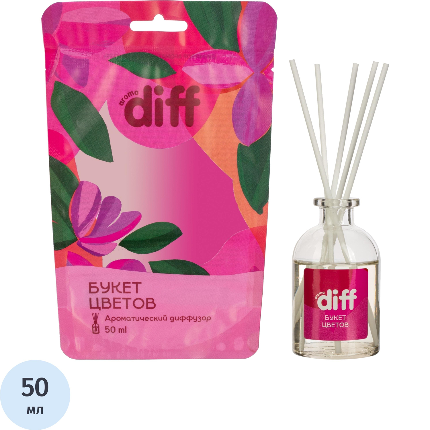 Аромадиффузор Aroma Harmony Diff Букет цветов 50 млБезопасный. Экологически чистый. Натуральный. Является прекрасной альтернативой ароматизированным спреям.Описание аромата: бергамот, вода, листья, роза лотос, фрезия, мускус.Флакона объёмом 50 мл хватит на помещение площадью до 15 кв.м.Чтобы наслаждаться потрясающим ароматом, необходимо просто поставить палочки во флакон и дождаться, пока аромат полностью наполнит пространство вокруг.Палочки важно применять сразу все и периодически переворачивать, чтобы поддерживать уровень ароматизации на должном уровне (1-2 раза в сутки).