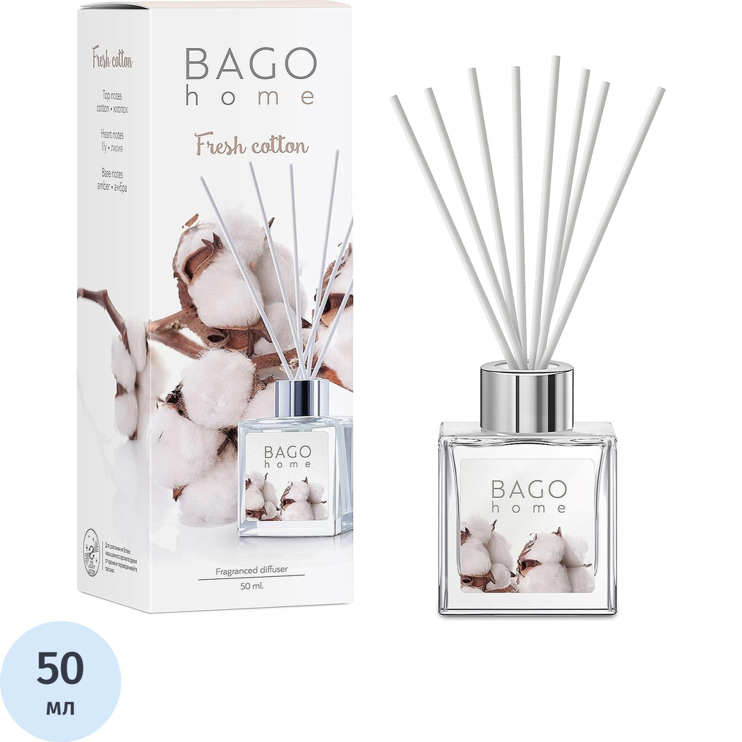 Аромадиффузор Bago home Свежий хлопок 50 млВремя работы от 4 до 6 недель.Площадь ароматизации от 5 до 15 м.Свежий аромат хлопка в сочетании со сладкой лилией.Пирамида аромата: хлопок, лилия, амбра.Bago home — это бренд ароматов для дома с европейским качеством. Главные ценности компании — создавать натуральные и экологически чистые ароматы для каждого дома. Огромная палитра ароматов, авторский дизайн, безопасный состав и контроль всего цикла производства — все это делает компанию уникальной на международном рынке, где бренд Баго хоум знают и любят уже в 12 странах.Базовая коллекция бренда, основа основ. Естественно звучащие фруктовые и цветочные ароматы подойдут как тем, кто раньше не ароматизировал помещения, так и давним ценителям парфюмерии для дома.Инструкция по применению:— Откройте упаковку и достаньте диффузор.— Открутите и снимите крышку, затем удалите защитную мембрану.— Закрутите крышку обратно на место.— Освободите фибровые палочки от скотча и вставьте 2-3 палочки в диффузор.— Используйте только те палочки, которые поставляются в комплекте с диффузором.— Добавьте больше палочек для усиления аромата при необходимости.— Разместите диффузор в подходящем месте, избегая прямых солнечных лучей и тепла.Безопасность использования:— Храните диффузор в местах, недоступных для детей.— Держите диффузор подальше от огня.— Не употребляйте содержимое диффузора внутрь.— При установке палочек убедитесь, что они полностью освобождены от защитного материала.— Располагайте диффузор вдали от прямых солнечных лучей и источников тепла для замедления испарения.— Избегайте установки в помещениях без вентиляции.