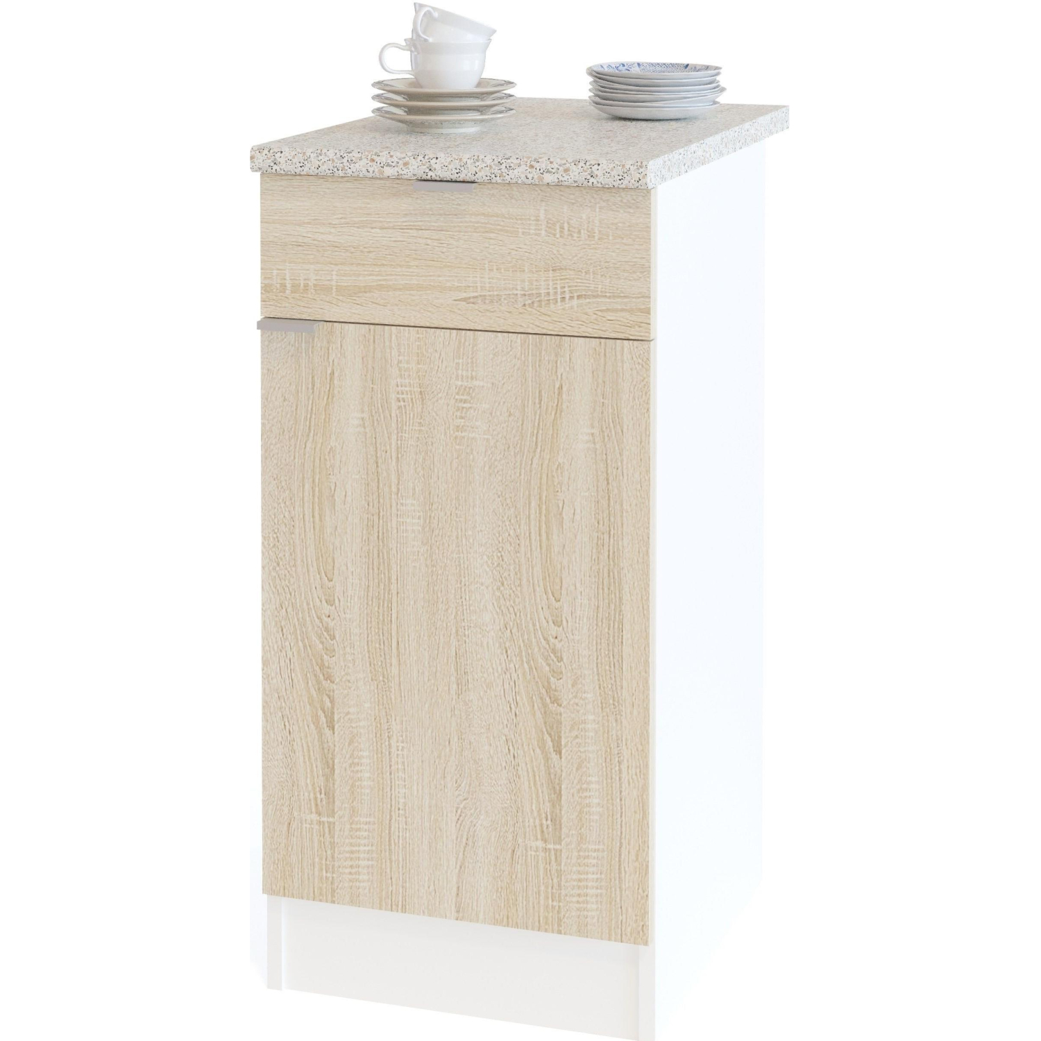 Кухонная рабочая тумба со столешницей, встроенным ящиком и полкой внутри. Дверь можно навесить на любую сторону. В ящике используются роликовые направляющие. Высота столешницы — 26 мм. Стол сделан из ЛДСП 16 мм, края обработаны кромкой ПВХ 0,4 мм. Ручки — металлические. Столешница изготовлена из ЛДСП с прочным тонким влагостойким бумажно-слоистым пластиком. Изображения товаров на сайте не могут гарантировать точную цветопередачу.