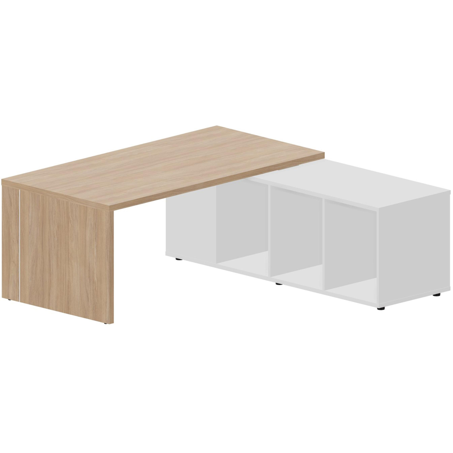 Внимание! Пожалуйста, проверяйте цвет изделия до начала сборки! Цвет на изображении товара в интернет-магазине или в печатном каталоге может отличаться от оригинала из-за особенностей цветопередачи. Столешницы и опоры изготовлены из ЛДСП (толщина 38 мм), края прямые из ПВХ (толщина 2 мм). Ширина столешницы 1800 мм. Общая ширина стола 2100 мм. Каркасообразующие и декоративные лицевые панели изготовлены из ЛДСП (толщина 18 мм), края прямые из ПВХ (толщина 2 мм). Крепление столешницы рабочего стола к опорам осуществляется эксцентриковыми стяжками и шкантами. Внешняя сторона опор декорирована врезным алюминиевым кантом (ширина 6 мм). Крепление каркасообразующей лицевой панели (для столов на двух опорах-панелях) к столешнице и опорам осуществляется при помощи эксцентриковых стяжек и шкантов. Конструкция столов и приставных элементов сборно-разборная, опоры снабжены регулировочными винтами для компенсации неровности пола (длина хода 15 мм, основание регулировочного винта из литого под давлением пластика). Оптимальная высота столов — 735 мм.Опорная сервисная тумба. Топ и основание тумбы изготовлены из ЛДСП (толщина 25 мм), края прямые из ПВХ (толщина 2 мм для топа и 0.45 мм для основания). Элементы каркаса тумбы изготовлены из ЛДСП (толщина 18 мм), края прямые из ПВХ (толщина 0.45 мм). Тумба оснащена 6-ю опорами с регулировочными винтами. Конструкция тумбы сборно-разборная с возможностью монтажа в правом и левом исполнении. Существует 3 варианта установки опорной сервисной тумбы относительно столешницы — без смещения или со смещением на 150 и 300 мм. Выбранный вариант реализуется досверливанием 4-х отверстий в топе тумбы. С внутренней стороны тумба имеет три одинаковых ниши, в любую из которых можно установить стандартную мобильную тумбу с тремя ящиками (без колёсных опор), сейф, офисный холодильник; остальные две ниши можно комплектовать полками и дверцами, оснащёнными системой открывания «push». Внешняя сторона тумбы имеет скрытую нишу, оборудованную полкой и дверцей с системой закрывания «push». Торцевая часть тумбы выполнена в виде ниши с полкой, которая может быть укомплектована дверцей, оснащённой системой закрывания «push».Сборка: — металлические винтовые соединения обеспечивают удобный и быстрый монтаж; — скобяные изделия прилагаются. Упаковка:— столешницы, опоры, лицевые панели — двухслойный гофрокартон, прямые прокладки из пенопласта по периметру изделия;— тумбы — картонные коробки, углы изделий по вертикали проложены жёстким картоном; — упаковки снабжены этикетками, содержащими информацию о продукте.