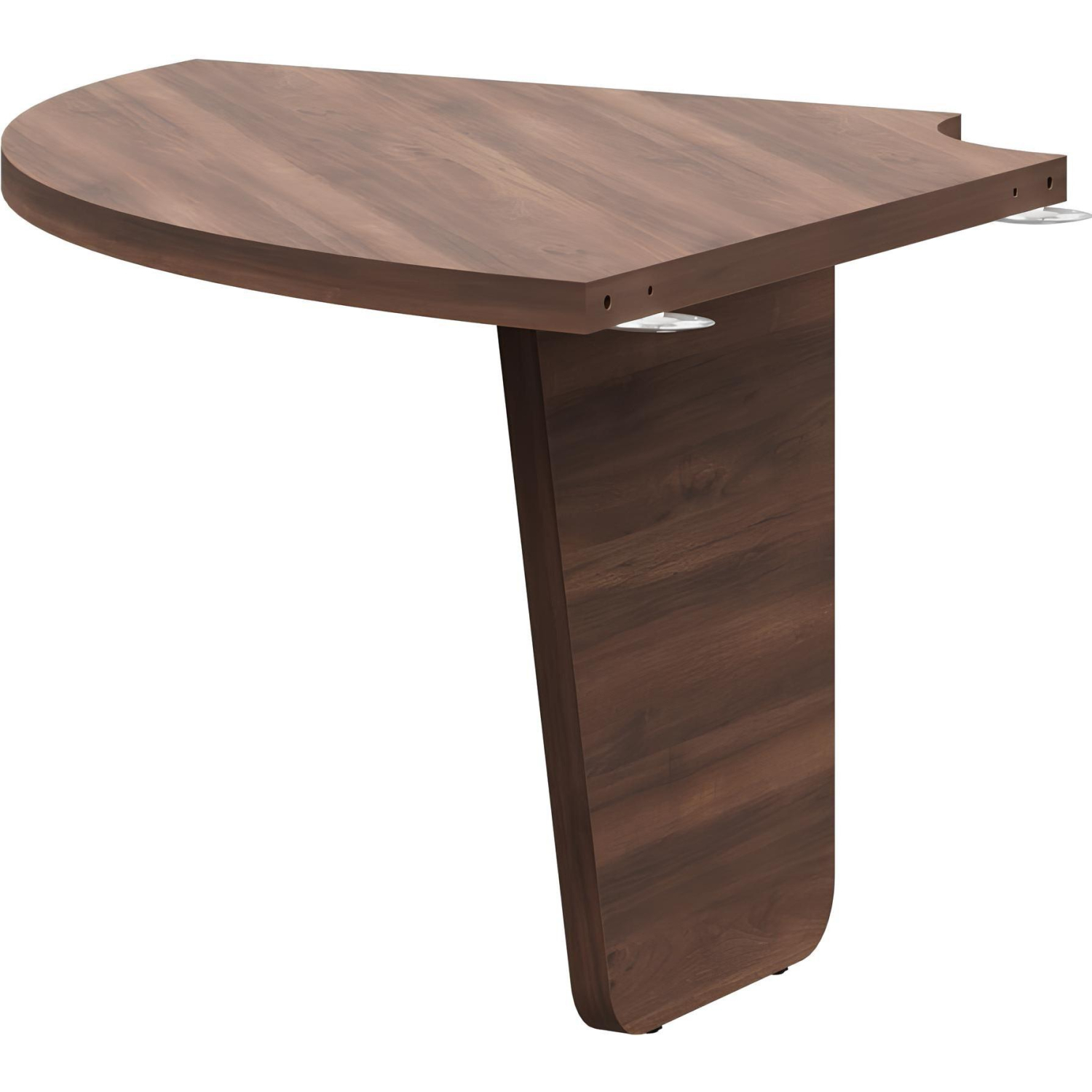 Внимание! Пожалуйста, проверяйте цвет изделия до начала сборки! Цвет на изображении товара в интернет-магазине или в печатном каталоге может отличаться от оригинала из-за особенностей цветопередачи. Модуль стола для заседаний. Столешница модуля выполнена из ЛДСП толщиной 38 мм и облицована кромкой ABS-пластик толщиной 2 мм. Исполнена в цвете орех бакаут с диагональным направлением текстуры дерева. Опора (каркас) модуля развернута на 90 градусов (выполнена из ЛДСП толщиной 38 мм, кромка ABS-пластик толщиной 2 мм). Опора имеет неправильную трапециевидную форму. Углы в нижней части опоры скруглены. Опора имеет регулировку по высоте для компенсации неровностей пола. В состав модуля входит одна металлическая пластина Siso для соединения двух угловых модулей между собой. Модуль стола не используется, как самостоятельный элемент, только как часть для формирования переговорного стола.