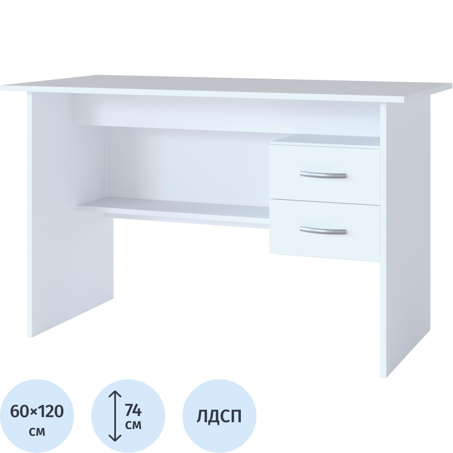 Большой письменный стол со встроенной тумбой. Внизу задней стенки также находится небольшая полочка. Встроенная тумба состоит из двух ящиков с открытой нишей сверху. За таким столом удобно будет себя чувствовать и школьник и студент. Стол также можно использовать как компьютерный. Стол выполнен в современном белом цвете. Стол изготовлен из высококачественного ЛДСП российского производства толщиной 16 мм с кромкой ПВХ 0,4 и 2 мм. Внутренний размер ящиков — 211×354 мм. Высота от пола до ящиков составляет 290 мм, высота от пола до полки под столом — 310 мм. Высота полочки над ящиками — 124 мм. Стол универсален при сборке, тумбу можно расположить с любой стороны. Максимальная нагрузка на стол — 50 кг.Изображения товаров на сайте не могут гарантировать точную цветопередачу.
