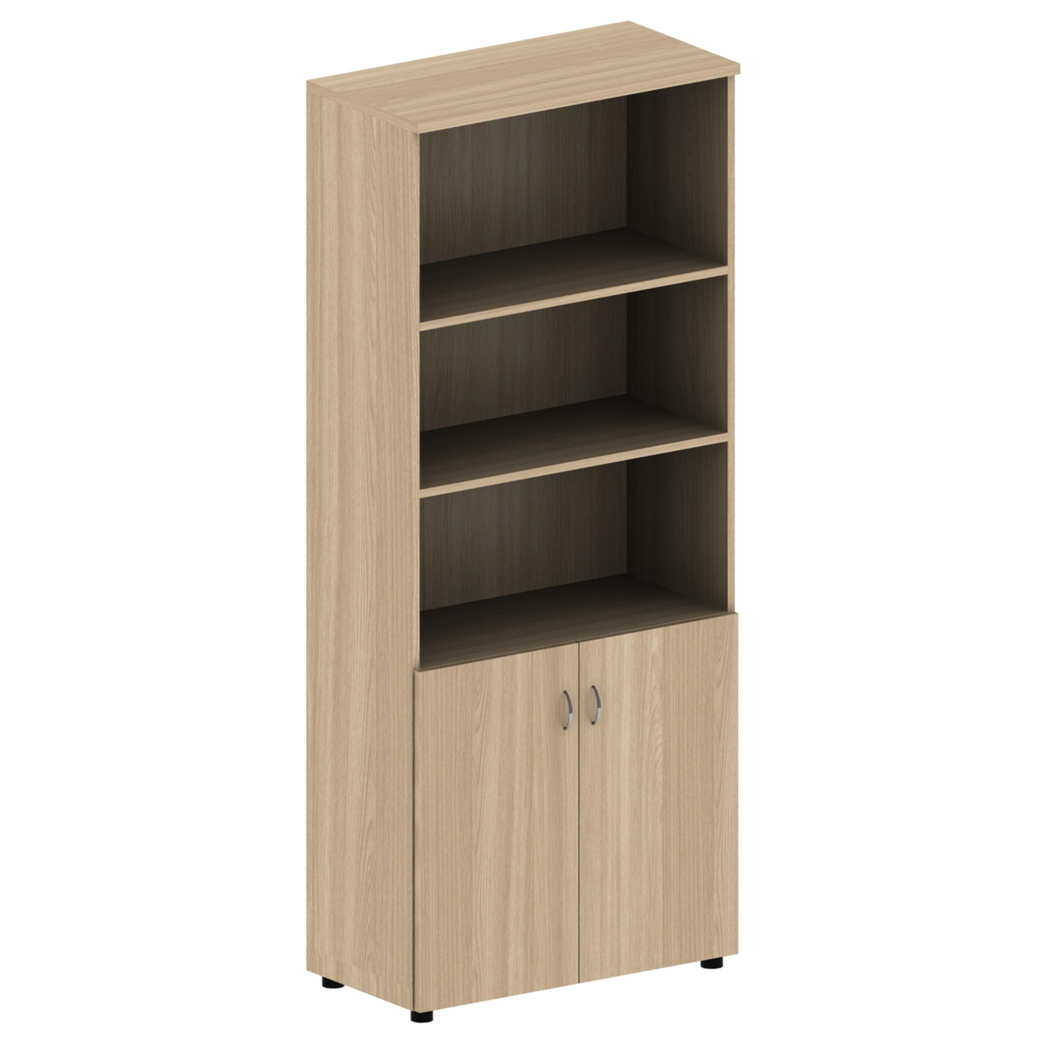 Шкаф полузакрытый высокий Агат АЯ-23.0 Топ, фасады, корпус шкафа и полки выполнены из ЛДСП цвета ясень шимо в тиснении шагрень. Толщина материала топа шкафа 22 мм, корпус, полки и фасады 18 мм. Задняя стенка шкафа выполнена из окрашенного ДВП цвета Беж толщиной 3 мм. Внутреннее пространство шкафа разделено четырьмя стационарными полками. Два нижних отделения закрыты двумя распашными фасадами высотой 700 мм, установленными на регулируемые петли. Метод крепления петель к корпусу шкафа евровинты. Стационарные полки установлены на скрытые полкодержатели. Направление текстур на всех полках равнонаправленное. Лицевая фурнитура тип скоба, цвет алюминий матовый, материал zamak, длина не менее 135 мм (межцентровое расстояние 96 мм). Глубина топа шкафа 400 мм, длина 800 мм. Высота шкафа в сборе 1910 мм. Топ шкафа отторцован противоударной кромкой ПВХ цвета Ясень Шимо толщиной не менее 2 мм, остальные детали отторцованы кромкой ПВХ цвета Ясень Шимо толщиной не менее 0,5 мм. Не допускается оставлять незакромленными открытые участки изделий даже на скрытых поверхностях, исключение только для соприкасающихся элементов. Используется только механический способ кромкооблицовки и подрезки. Категорически не допускаются ручная обработка кромочного материала, наличие следов клея, зазоры, выступы, сколы, потертости, заусенцы и прочие повреждения кромки. Для соединения деталей используются направляющие деревянные шканты (бук) и двухкомпонентная эксцентриковая стяжка d15 мм. Метод крепления задней стенки ДВП в паз с применением пластикового профиля для надежного соединения составных частей. В крепежных элементах отсутствуют одноразовые винты типа шуруп или конфирмант, а также скобы для крепления ДВП. Для нивелирования неровностей пола на днище шкафа установлены четыре регулируемых по высоте опоры с ходом регулировки 15 мм. Диаметр опор 50 мм, высота 27 мм, цвет черный. Регулировка высоты осуществляется через технологические отверстия, расположенные внутри шкафа. Расстояния между полками 365 мм.