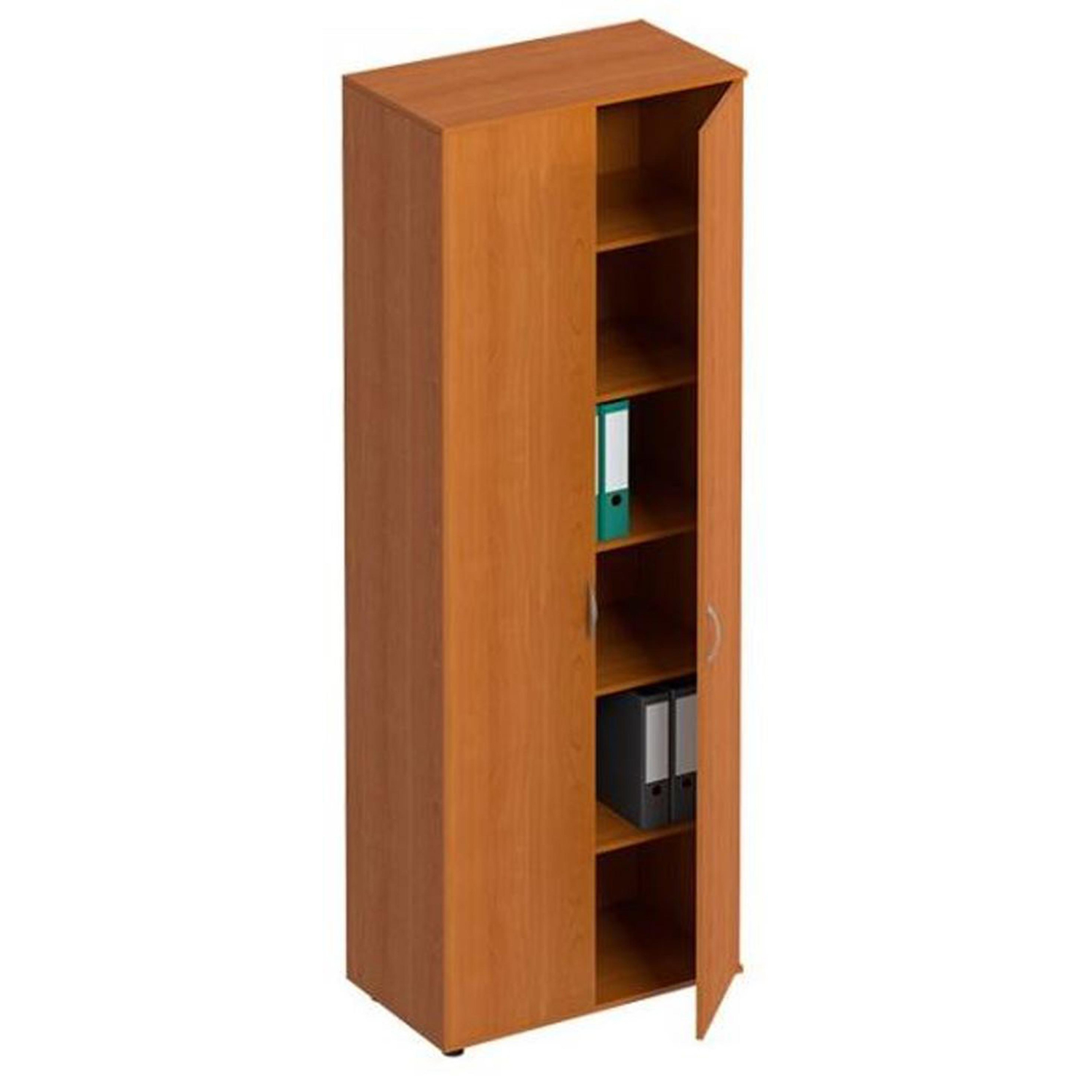Внимание! Пожалуйста, проверяйте цвет изделия до начала сборки! Цвет на изображении товара в интернет-магазине или в печатном каталоге может отличаться от оригинала из-за особенностей цветопередачи.Шкаф состоит из корпуса, полок и дверей. Корпус состоит из боковых стенок, выполненных из ЛДСП толщиной 16 мм, верхнего и нижнего щитов, выполненных из ЛДСП толщиной 22 мм. Соединение деталей при помощи эксцентриковых стяжек и направляющих шкантов. Передние торцевые кромки верхнего и нижнего щитов облицованы материалом кромочным из ПВХ толщиной 2 мм, остальные торцевые кромки облицованы материалом кромочным из ПВХ толщиной 0,4 мм. Задняя стенка выполнена из ДВП толщиной 3,2 мм, поверхность которой облицована с одной стороны декоративной пленкой в цвет ЛДСП. Задняя стенка устанавливается в пазы деталей корпуса и для придания дополнительной жесткости фиксируется с обратной стороны пластиковыми уголками и шурупами. Полки второго и четвертого уровней зафиксированы между боковинами на эксцентриковых стяжках. Остальные полки съемные имеют несколько уровней установки. Полкодержатель металлический цилиндрический. Полки выполнены из ЛДСП толщиной 22 мм, торцевые кромки по периметру облицованы материалом кромочным из ПВХ толщиной 0,4 мм. Полки делят внутреннее пространство шкафа на отделения высотой от 33 см, что позволяет размещать офисные папки. Корпус устанавливается на 4 пластиковые опоры черного цвета диаметром 50 мм, регулируемые по высоте изнутри каркаса. Минимальная высота опоры 27 мм, максимальная высота опоры 37 мм. Двери глухие выполнены из ЛДСП толщиной 16 мм, торцевые кромки по периметру облицованы материалом кромочным из ПВХ толщиной 0,4 мм. Петли дверей накладные металлические 4-х шарнирные импортного производства с возможностью регулировки в 3-х направлениях. Металлическая ручка-скоба, цвет хром матовый с межосевым расстоянием 96 мм. Резиновые амортизаторы смягчают закрывание дверей.