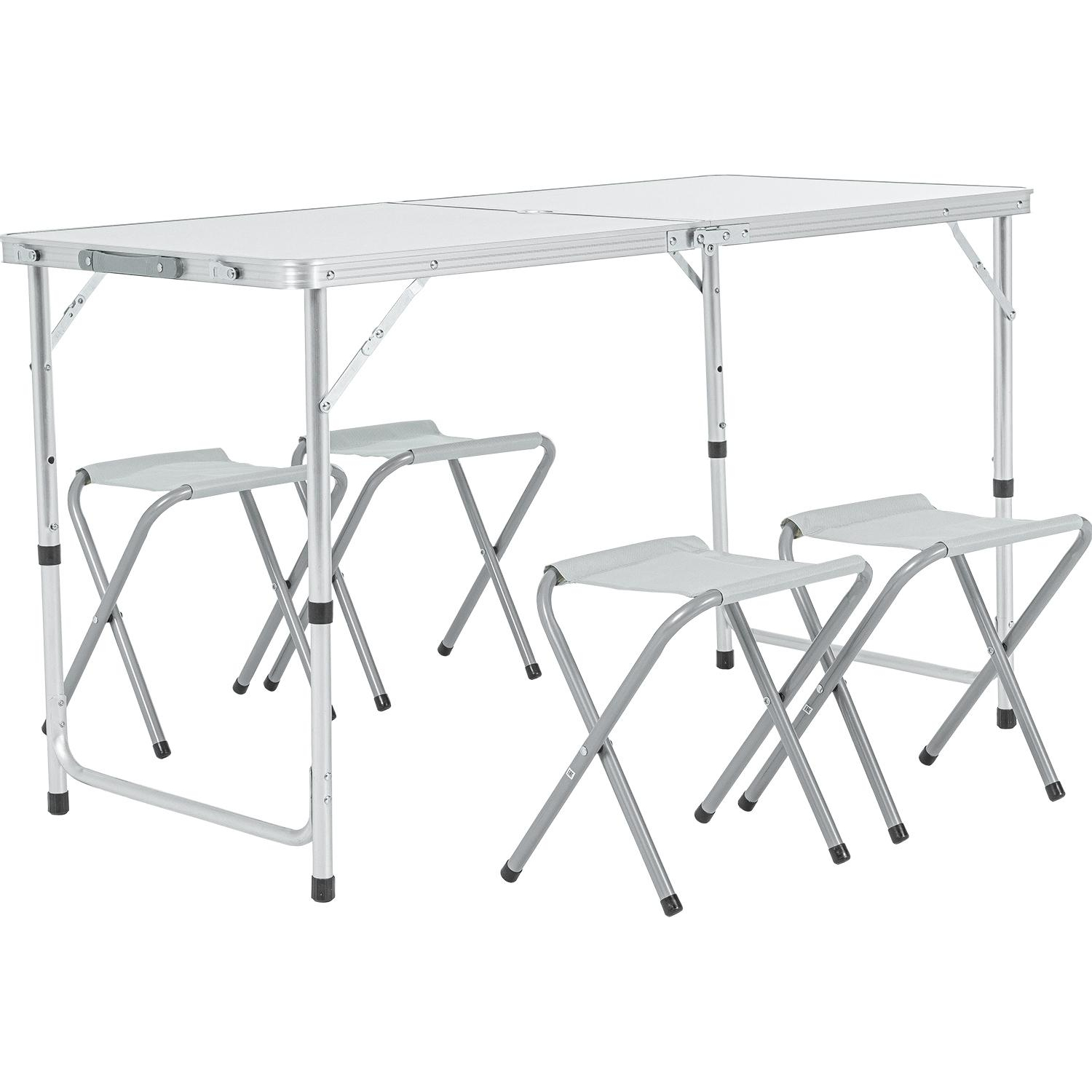 Внимание! Пожалуйста, проверяйте цвет изделия до начала сборки! Цвет на изображении товара в интернет-магазине или в печатном каталоге может отличаться от оригинала из-за особенностей цветопередачи. Набор мебели просто незаменим для отдыха на природе. Набор включает в себя большой складной стол и четыре стула. Стол имеет прочный алюминиевый каркас и влагостойкую столешницу. Ножки регулируются по высоте. В центре стола есть отверстие для установки садового зонта. Стол легко складывается в компактный чемодан с ручкой для переноски, стулья помещаются внутри. Максимальная статическая нагрузка на стул — 110 кг. Максимальная статическая нагрузка на стол — 40 кг. Размер стола (ШхГхВ) 1200×600×540 мм. Размер стула (ШхГхВ) 330×370×350 мм.