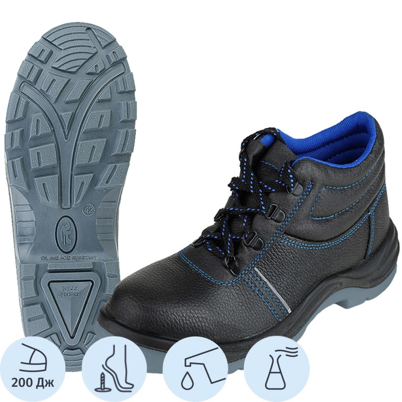 Ботинки рабочие 12/1С ПУ из искусственной кожи с металлическим подноском чёрные (размер 41). Кожаные ботинки Prosafe серии basic c мягким кантом и глухим клапаном для защиты ног от общих производственных загрязнений в отапливаемых помещениях и на открытом водухе в летний период. Сетчатая подкладка и съемная стелька создают комфортные условия носки в течении рабочей смены. Шнуровка обеспечивает комфортную адаптивную посадку. Светоотражающие элементы повышают видимость работников в тёмное время суток, а также на неосвещенной территории. Двухслойная полиуретановая подошва литьевого метода крепления имеет вставку в пяточной части подошвы, обладающую амортизационными свойствами и способную гасить ударные нагрузки при ходьбе. Глубина протектора ходового слоя обеспечивает хорошую сцепляемость с поверхностями и препятствует скольжению за счет рельефа протектора. Металлический подносок обеспечивает защиту пальцев стопы от механических повреждений ударной прочностью до 200Дж. Данная модель оснащена внутренней антипрокольной металлической стелькой 1100Н. Данная модель защищает от общих производственных загрязнений, кислот и щелочей, от механического воздействия, проколов, истирания, от нефти и нефтепродуктов. Соответствует стандартам ГОСТ 12.4.137-2001, ГОСТ 12.4.177-89, ГОСТ 12.4.187-97, ГОСТ 28507-99, ТР ТС 019/2011.Законодательные и технические документы