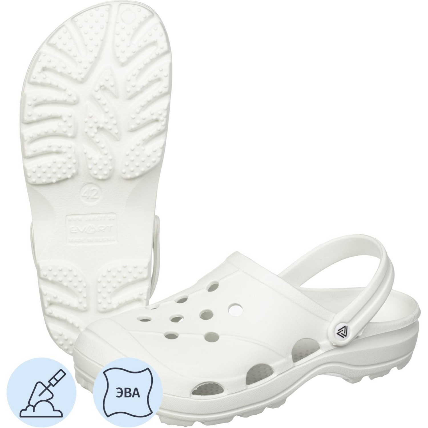Сабо мужские EVART Ола ЭВА белые размер 41. Обувь предназначена для сотрудников предприятий общественного питания, медицинских работников, работников пищевой и легкой промышленности. Верх и подошва изготовлены из материала ЭВА. Литьевой метод крепления подошвы повышает надежность.Сабо с открытой пяткой легко надевать и снимать. Упругая подошва и массажная стелька из мягкого материала снижают нагрузку на суставы, способствуя лучшей амортизации. Широкая носочная часть препятствует деформации пальцев ног. Отверстия по всей союзке создают циркуляцию воздуха, улучшая вентиляцию. Обувь легкая, водонепроницаемая, гипоаллергенная, не впитывает запахи и не требует особого ухода. Также не развивает бактерий и микробов. Большемерит на 1 размер. Срок годности неограничен. Минимальная рекомендованная температура эксплуатации — до −10C. Сабо соответствуют стандартам ТР ТС 017/2011. Цвет на изображении товара в интернет-магазине или в печатном каталоге может отличаться от оригинала из-за особенностей цветопередачи.