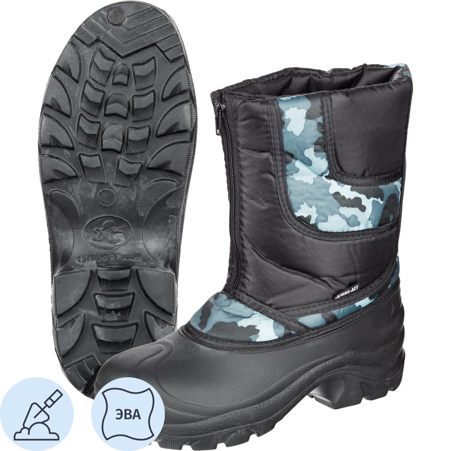 Сапоги мужские 122 ЭВА комбинированные утепленные камуфляжные размер 45. Рекомендуются для защиты ног в условиях повышенных загрязнений. Верх выполнен из водоотталкивающей ткани, сдублированной поролоном и утеплителем из нетканого полотна с ворсом. Обувь оснащена застежкой на молнию для удобства эксплуатации. Подошва из ЭВА легкая, устойчивая к морозам до −40°C и обеспечивает отличную амортизацию. Подошва крепится цельнолитым методом, что повышает долговечность и прочность обуви. Высота голенища составляет 27 см. Подкладка для просушивания не вынимается. Из-за нестандартной колодки и утеплителя рекомендуется приобретать обувь на размер больше. Сапоги соответствуют стандартам ГОСТ 26167-2005 и ТР ТС 017/2011. Гарантийный срок эксплуатации — 30 дней при соблюдении правил ухода и хранения.