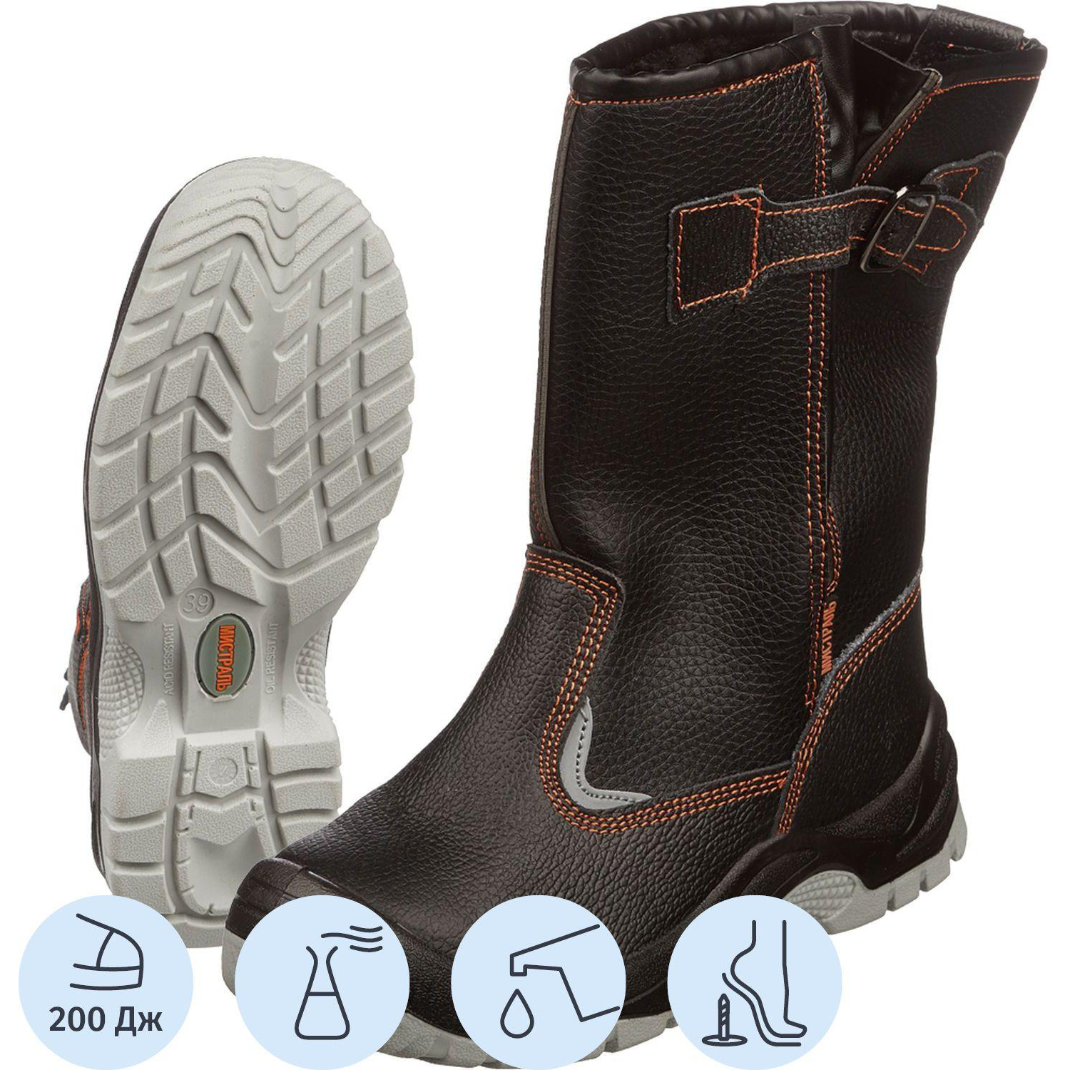 Сапоги модели Мистраль подойдут как для мужчин, так и для женщин. Выполнены в чёрном цвете. Размер — 43. Обувь рекомендована к использованию в строительстве, озеленении территории, ЖКХ, промышленности, логистике, нефтегазовой промышленности. Рабочая обувь из натуральной кожи долговечна, устойчива к повреждениям, комфортна в носке. Утеплитель из искусственного меха хорошо держит тепло, рассчитан на температурные режимы до −10°C. Противоударный металлический подносок защищает от ударов силой до 200 Дж.Полиуретановая с термополиуретаном подошва (ПУ+ТПУ) устойчива к воздействию химических факторов (нефть, масла, щелочь и кислота). Подошва обладает прекрасным сопротивлением к скольжению. Промежуточный слой из полиуретана придает подошве легкость, а ходовой слой из термополиуретана увеличивает срок службы за счет устойчивости к многократному изгибу, деформации и истиранию. Подошва обуви скреплена литьевым методом крепления. Данный метод обеспечивает надежное, герметичное крепление слоев подошвы, а значит, долгий срок службы и высокую гибкость, тем самым уменьшая усталость ног. Металлическая стелька защищает от проколов. Данная модель маслобензиностойкая. Защитные свойства обуви: Мун 200 (защита от ударов в носочной части энергией 200 Дж), Тн (защита от пониженных температур воздуха), З (защита от общих производственных загрязнений), а также от кислот и щелочей. Гарантийный срок после выдачи обуви составляет 70 дней при соблюдении правил ухода, эксплуатации и хранения. Соответствуют стандартам ТР ТС 019/2011. Цвет на изображении товара в интернет-магазине или в печатном каталоге может отличаться от оригинала из-за особенностей цветопередачи монитора.