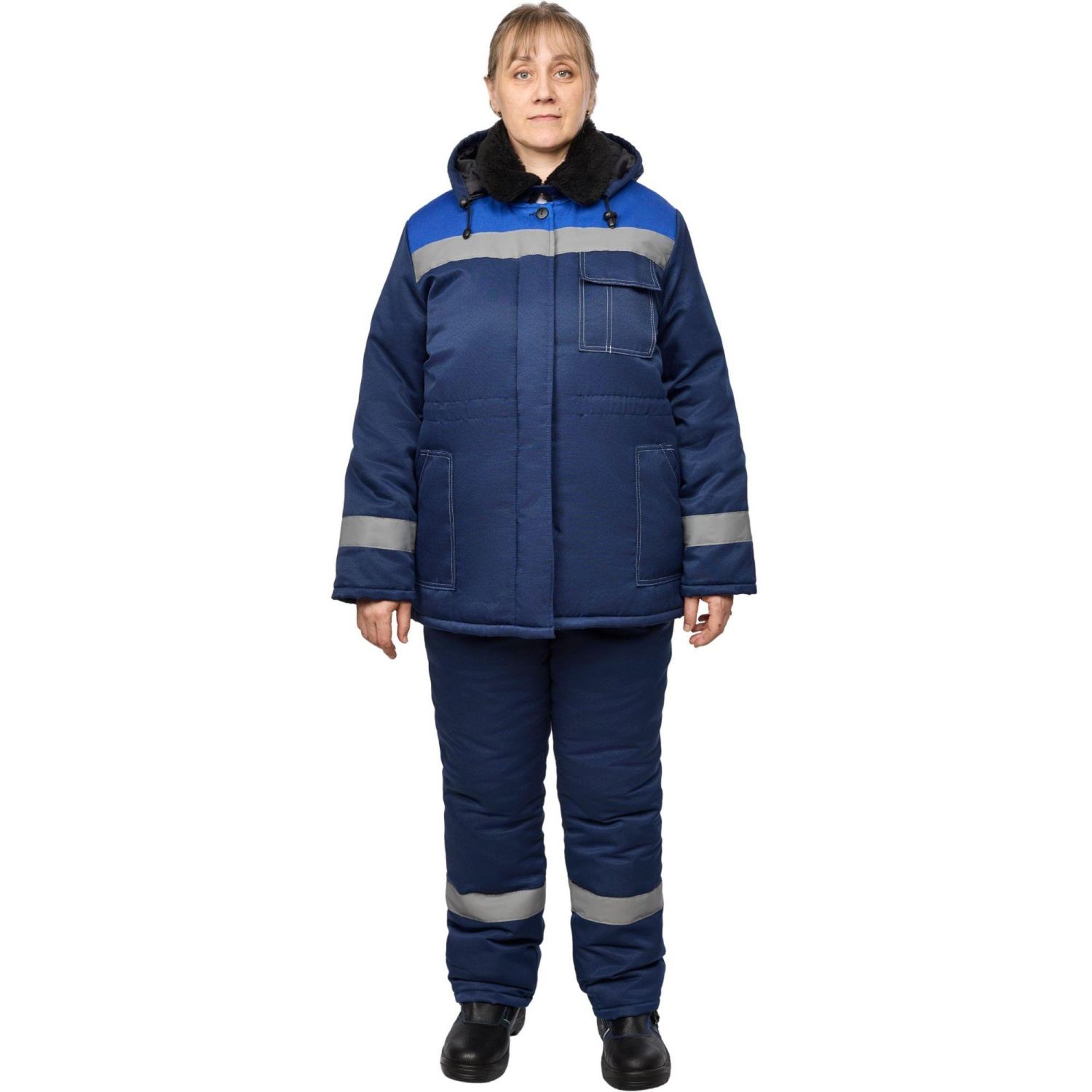 Куртка рабочая зимняя женская з32-КУ с СОП синяя/васильковая из ткани грета (размер 64-66, рост 170-176). Рекомендуется для использования в ЖКХ, озеленении территории, строительстве, проведении ремонтных работ, промышленности, логистике, сельском хозяйстве. Изготовлена из смесовой ткани (тип 3) — 80% полиэстер, 20% хлопок с водоотталкивающей пропиткой. Плотность ткани: 190 г/кв.м. Такой материал обладает улучшенными эксплуатационными характеристиками. Благодаря высокой плотности он непроницаем для пыли, отличается высокой износостойкостью. Сохраняет яркий цвет. Утеплитель — синтепон плотностью 360 г/кв.м (основа) 3 слоя по 120 г/кв.м и 240 г/кв.м (руки) 2 слоя по 120 г/кв.м. Технология изготовления термоскрепленного синтепона (евросинтепона) позволяет использовать данный утеплитель для создания более тонких изделий с сохранением термозащитных свойств. Важными преимуществами утеплителя являются легкость и хорошая пластичность, что улучшает подвижность в костюме. А также исключение миграции волокна через ткани верха и подкладки за счет скрепления слоев. Материал подкладки — 100% полиэстер. Защитные свойства: — Тн — от пониженных температур; — Ми — от механических повреждений (истирания); — З — от общих производственных загрязнений. Светоотражающая полоса шириной 5 см размещена спереди, сзади между кокеткой и нижней частью куртки, а также на рукавах. Куртка прямого силуэта, удлиненная, с центральной бортовой супатной застежкой на 5 петель-пуговиц. Полочка отрезная по линии кокетки. Наличие двух нижних накладных карманов с косым срезом и наличие одного накладного нагрудного кармана с клапаном с двойной контрастной отстрочкой. Низ куртки обработан швом в подгибку с закрытым срезом. По линии талии настрочена кулиса со сквозным выходом наизнанку, регулируется шаровым фиксатором и шнуром. Спинка прямая, отрезная по линии кокетки. Рукав прямой, втачной, одношовный. Внутри рукава по нижней части на подкладку притачан трикотажный манжет. Воротник меховой, спереди застегивающийся на пуговицу. Капюшон отстегивается. Соответствует стандартам ГОСТ 12.4.303-2016, ТР ТС 019/2011.Коллекция зимней спецодежды з32 представлена в двух видах ткани — смесовой с влагоотталкивающей пропиткой и Оксфорд. К куртке з32-КУ из смесовой ткани подходят брюки з32-БР из аналогичной ткани. Подобрать размерЦвет на изображении товара в интернет-магазине или в печатном каталоге может отличаться от оригинала из-за особенностей цветопередачи монитора.