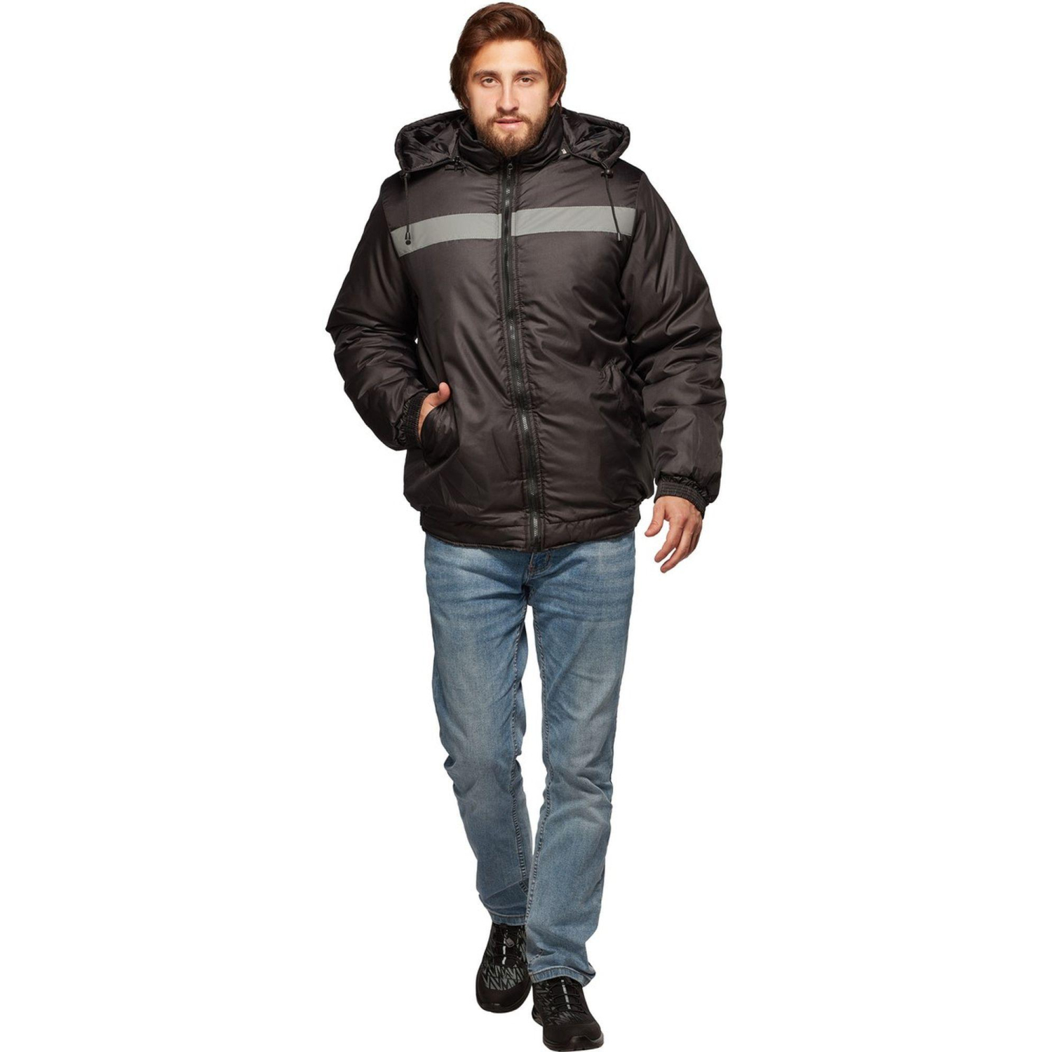 Куртка рабочая зимняя (куртка-бомбер) мужская с СОП черная (размер 60-62, рост 182-188). Рекомендуется для использования в ЖКХ, строительстве, пищевой и нефтегазовой отраслях. Изготовлено из 100% полиэстера. Плотность ткани: 80 г/кв.м. Подкладка: таффета (полиэстер). Утеплитель — синтепон плотностью 400 г/кв.м (основа) 2 слоя по 200 г/кв.м. и 200 г/кв.м (рукав) 1 слой. Защитные свойства: — Защищает от пониженных температур. Куртка прямого кроя. Светоотражающая полоса шириной 5 см расположена на груди. В районе талии есть два вместительных кармана. Есть также один внутренний карман. У куртки есть водоотталкивающая пропитка. Климатический пояс: III. Соответствует стандартам ГОСТ 12.4.303-2016, ТР ТС 019/2011. Подобрать размер Цвет на изображении товара в интернет-магазине или в печатном каталоге может отличаться от оригинала из-за особенностей цветопередачи монитора.