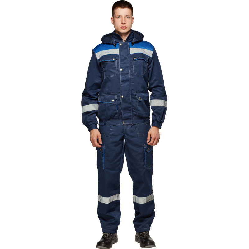 Костюм рабочий летний мужской синий/васильковый. Состав ткани: 80% полиэстер, 20% хлопок. Плотность ткани: 200 +/- 10 г/кв.м. Верхние накладные карманы с фигурными клапанами и перекантом на кнопках. Нижние карманы с полуобъемом, с фигурными клапанами и перекантом на кнопках. Укороченная куртка на поясе с частичной стяжкой на эластичной резинке. Съемный капюшон на пуговицах с регулировкой объема по лицевой части. Полукомбинезон с многофункциональными карманами. Эластичная резинка по талии спинки. В костюме используется светоотражающая полоса 50 мм. Размер: 44-46. Рост: 182-188.Подобрать размер