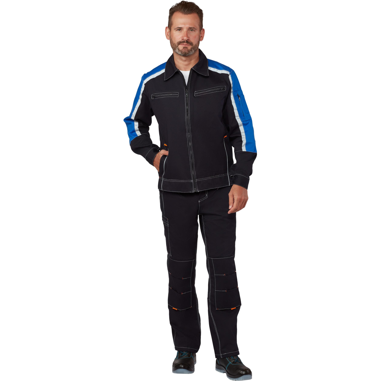 Костюм рабочий летний мужской л34-КПК с СОП синий/васильковый (размер 52-54, рост 182-188 см). Куртка прямого силуэта, короткая, с центральной застежкой на молнию, с отложным воротником, с верхними прорезными карманами на молнии, с нижними прорезными карманам. Рукава резные, с притачными манжетами застегивающимися на пуговицу, на левом рукаве накладной карман на молнии с малым накладным карманом. В костюме вставлен СОП шириной 25 мм и кант для обеспечивающая безопасность работы в условиях пониженной видимости. Полукомбинезон с застежкой гульфика на молнию и застежкой в боковом шве на пуговицы, с накладным фигурным карманом нагрудника застегивающимся на молнию, нижними внутренними боковыми карманами, с объемными наколенниками с нижним входом для амортизационного вкладыша, с накладным карманом на правом боковом шве на молнии. В полукомбинезоне предусмотрен кант и фигурный СОП для обозначения сигнальной видимости. Стандарты: ГОСТ 12.4.280-2014.Подобрать размер