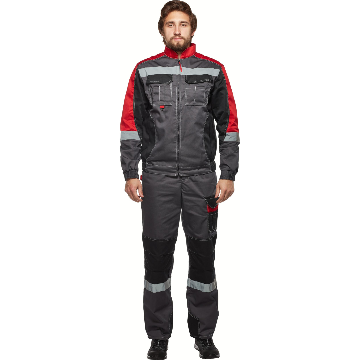 Костюм рабочий летний мужской серый/красный.Состав ткани: 65% полиэстер, 35% хлопок. Плотность ткани: 240 г/кв.м. Костюм с контрастной отстрочкой. Накладные карманы с фигурными клапанами на ленте-контакт с держателем полукольца. Нижние прорезные карманы на молнии. Низ куртки с обтачкой, с регулировкой низа хлястиками, с полукольцом на ленте-контакт.Полукомбинезон с многофункциональными карманами. Застежка гульфика на молнию и в правом боковом шве на пуговицы. Усилительные накладки в области коленей и по низу шаговых швов. Эластичная резинка по талии спинки. Бретели на пластиковых застежках (фастексах), регулирующиеся по длине за счет эластичной резинки.В костюме используется светоотражающая полоса 50 мм.Размер: 52–54. Рост: 170–176.Подобрать размер
