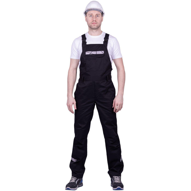 Полукомбинезон рабочий летний мужской Стронг с СОП чёрный (размер 120-124, рост 182-188). Застежка-гульф на молнию. Боковая застёжка на петли и пуговицы. Пояс с эластичной лентой по спинке, с шлевками. Нагрудный накладной карман с клапаном фигурной формы на ленте-контакт, с малым накладным карманом с двумя секциями. Боковые карманы с наклонным входом. На правой задней половинке брюк накладной карман и карман для инструментов. Бретели частично с эластичной лентой и с застёжкой на фастексы. Усилительные накладки (наколенники с защипами по боковым швам для свободы движения). Горизонтальная термоклеевая световозвращающая полоса шириной 30 мм. располагается по клапану нагрудного кармана, вверху спинки, низу брюк в области боковых швов. <a href='https://www.komus.ru/news/spravochnik-pokupatelya/vybor-razmera-spetsodezhdy/n/15/'>Подобрать размер Цвет на изображении товара в интернет-магазине или в печатном каталоге может отличаться от оригинала из-за особенностей цветопередачи монитора.