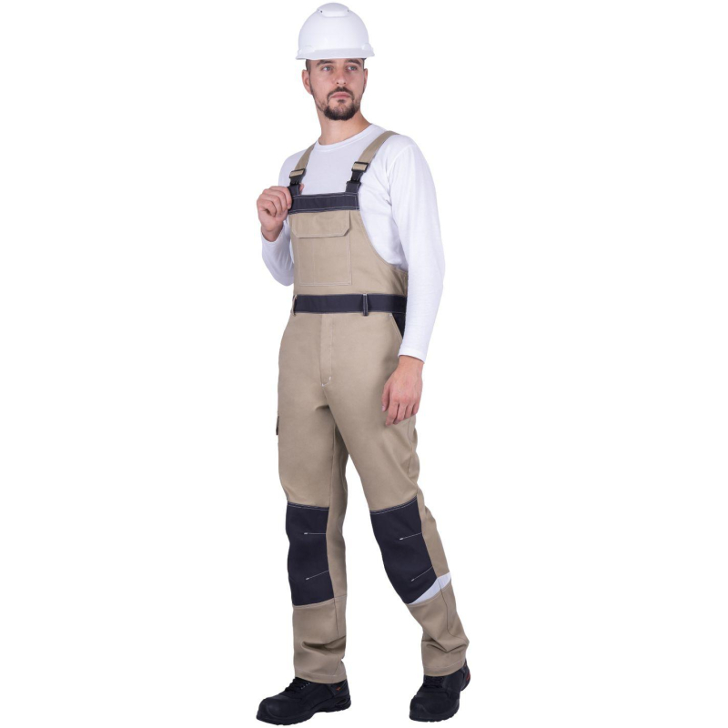 Полукомбинезон рабочий летний мужской Турбо Safety с СОП бежевый/серый (размер 104-108, рост 182-188). Ткань: 'Томбой', отделка Easy Care (легкий уход). Состав: 67% полиэфир, 33% хлопок, пл. 245 г/кв.м. Стандарты: ТР ТС 019/2011; ГОСТ 12.4.280-214. Защитные свойства: Ми - защита от механических воздействий (истираний); З - защита от общих производственных загрязнений. Притачной нагрудник и спинка. Боковая застёжка на пуговицу и застёжка-молния в среднем шве. Бретели с эластичной тесьмой с застёжкой на фастекс. Пояс с эластичной лентой (по спинке). Шесть карманов (на нагруднике накладной с клапаном с застёжкой текстильной, два боковых с наклонным входом, два накладных на задней половинке, накладной - двухсекционный с клапаном на правом боковом шве). Наколенники с вытачками для свободы движения. Световозвращающие элементы фигурной формы спереди и сзади полукомбинезона. <a href='https://www.komus.ru/news/spravochnik-pokupatelya/vybor-razmera-spetsodezhdy/n/15/'>Подобрать размер Цвет на изображении товара в интернет-магазине или в печатном каталоге может отличаться от оригинала из-за особенностей цветопередачи монитора.