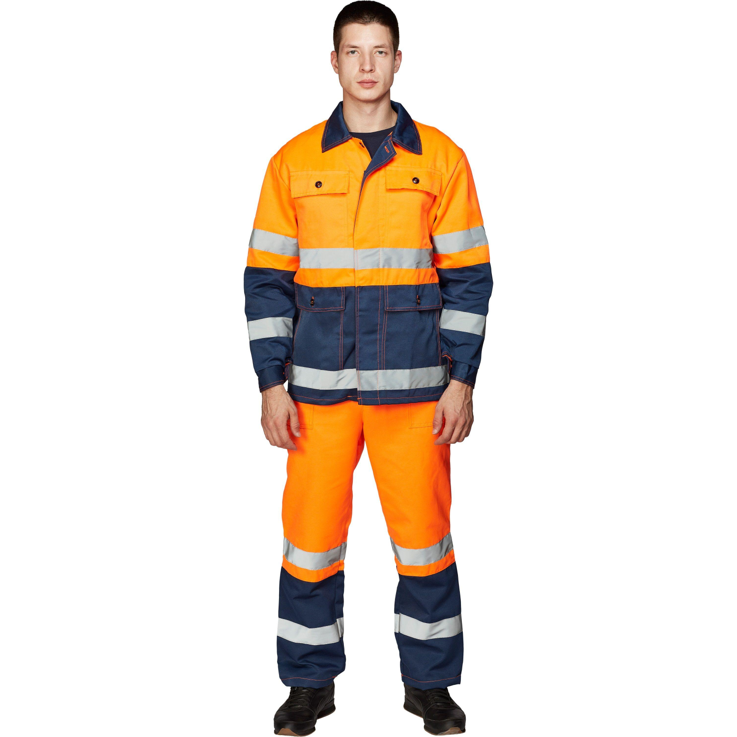 Костюм дорожный летний с полукомбинезоном Спектр-КПК оранжевый/синий с СОП (размер 60-62, рост 170-176)Костюм выполнен из смесовой ткани Темп-1 (80% полиэстер, 20% хлопок) с плотностью 200 г/кв.м и водоотталкивающей пропиткой.Защитные свойства: от общих производственных загрязнений. Основной цвет — оранжевый, нижние части куртки и брюк, а также некоторые элементы выполнены в синем цвете.Куртка удлиненного прямого силуэта, с отложным воротником и втачными рукавами с манжетами на пуговицах. Верхняя часть — оранжевая, нижняя — синяя. На куртке предусмотрены накладные карманы: верхние оранжевые и нижние синие с клапанами на пуговицах. Сигнальные полосы шириной 5 см нашиты на верхней и нижней частях куртки. Застежка — супатная на 6 пуговиц.Полукомбинезон с регулируемыми бретелями и пряжками. Брюки имеют накладные карманы с косым входом и задний накладной карман. В области талии сзади вшита резинка. Низ брючин синего цвета с нашитыми сигнальными полосами шириной 5 см. Гульфик застегивается на супатную застежку с 3 пуговицами.Особенности конструкции:— Прямой крой, не стесняющий движений;— Элементы отражения света — полосы, расположены на груди, спине, рукавах и брюках;— Карманы различного назначения для удобного хранения инструментов.Рекомендации по уходу: машинная стирка при температуре до 40°C. Класс риска: 1. Стандарты: ГОСТ 12.4.281-2014, ТР ТС 019/2011.Подобрать размер Цвет на изображении товара в интернет-магазине или в печатном каталоге может отличаться от оригинала из-за особенностей цветопередачи монитора.