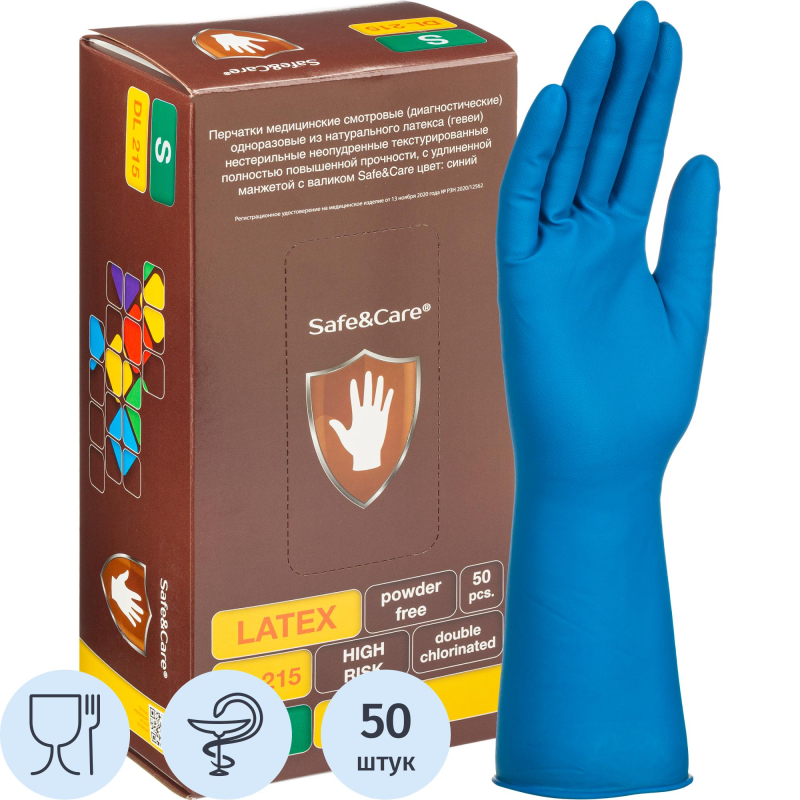 Перчатки медицинские смотровые S&C High Risk DL 215 латексные неопудренные с двойным хлорированием синие (размер S, 50 штук/25 пар в упаковке). Перчатки нитриловые DL 215 — это универсальные смотровые перчатки, предназначенные для использования в различных областях, включая пищевую промышленность. Изготовленные из латекса, они имеют толщину ладони 0,6 мм и пальцев 0,7 мм, что обеспечивает необходимую прочность и тактильную чувствительность.Перчатки упакованы по 50 шт. в картонную коробку и производятся в Таиланде. Они соответствуют требованиям ГОСТ Р 52239-2004. Синий цвет перчаток позволяет быстро идентифицировать их во время работы. Поверхность перчаток текстурирована, а сами они не опудрены.Особенностью данной модели является ее повышенная прочность — перчатки маркируются как «особопрочные». Длина перчаток составляет 300 мм, вес пары — 36 г, размер S.Перчатки DL 215 не обеспечивают защиту от кислот и щелочей, но подходят для использования в пищевой промышленности. Они зарегистрированы как медицинское изделие. Транспортная упаковка — 10 коробок по 50 шт.