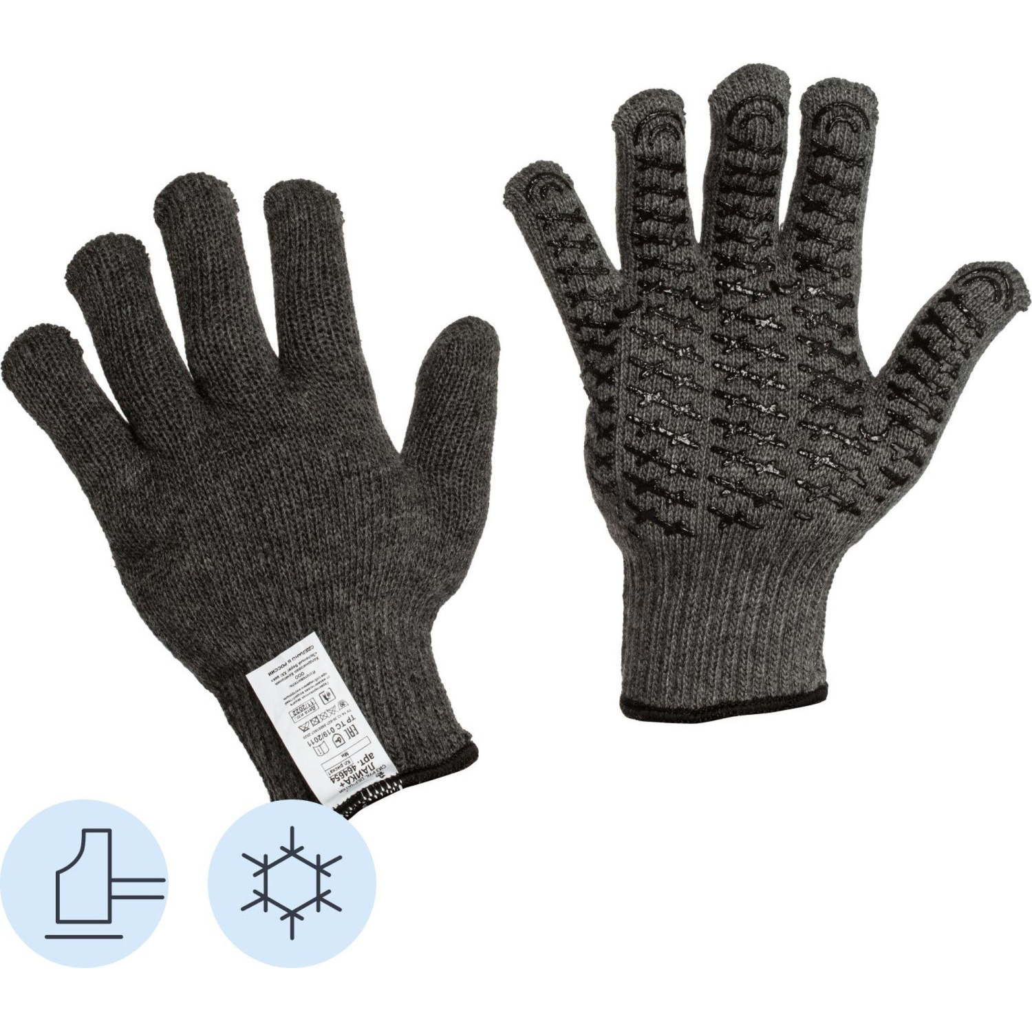 Перчатки рабочие утеплённые Ампаро Лайка + полушерстяные с ПВХ покрытием серые (4 нити, 7, 10 классы вязки, размер 9, L)Перчатки разработаны для защиты рук от пониженных температур и механических воздействий. Верх перчаток изготовлен из полиакрилонитрильной (ПАН) пряжи, которая сочетает теплоизоляционные свойства с высокой механической прочностью. Подкладка выполнена из высококачественной полушерстяной пряжи, состоящей на 50% из шерсти и на 50% из ПАН, что обеспечивает надёжную теплоизоляцию и комфорт при длительном ношении. Класс вязки: 7 внутренний слой, 10 внешний слой.Перчатки имеют точечное покрытие из эластомера на основе ПВХ, которое увеличивает механическую прочность изделия и улучшает захват предметов за счёт высокого трения с различными поверхностями. Это делает их удобными для работы с инструментами и материалами в сухих условиях рабочей среды. Манжета выполнена из трикотажа, что обеспечивает комфортную посадку на руке.Изделия рекомендованы для эксплуатации во II, III и особом климатических поясах и обеспечивают защиту от контакта с охлаждёнными поверхностями до −5°С. Они подходят для использования в строительстве, ремонте и других общепроизводственных работах. Защитные свойства включают стойкость к истиранию (Ми) и защиту от холода (Тхп 5). В упаковке одна пара. Перчатки не поддерживают работу с сенсорными экранами и не обладают антистатическими свойствами.Стандарты: ТР ТС 019/2011, ГОСТ 12.4.252-2013, ГОСТ EN 388-2019, ГОСТ 12.4.274-2014. Эксплуатационный уровень: EN 388-1241. Расшифрока: — Стойкость к истиранию — 1 (483).— Стойкость к порезу — 2 (2,5).— Стойкость к раздиру — 4 (76).— Стойкость к проколу — 1 (21).— TDM: сопротивление порезу — В (6).Внешний вид и/или характеристики товара могут быть изменены производителем в соответствии с производственным процессом.