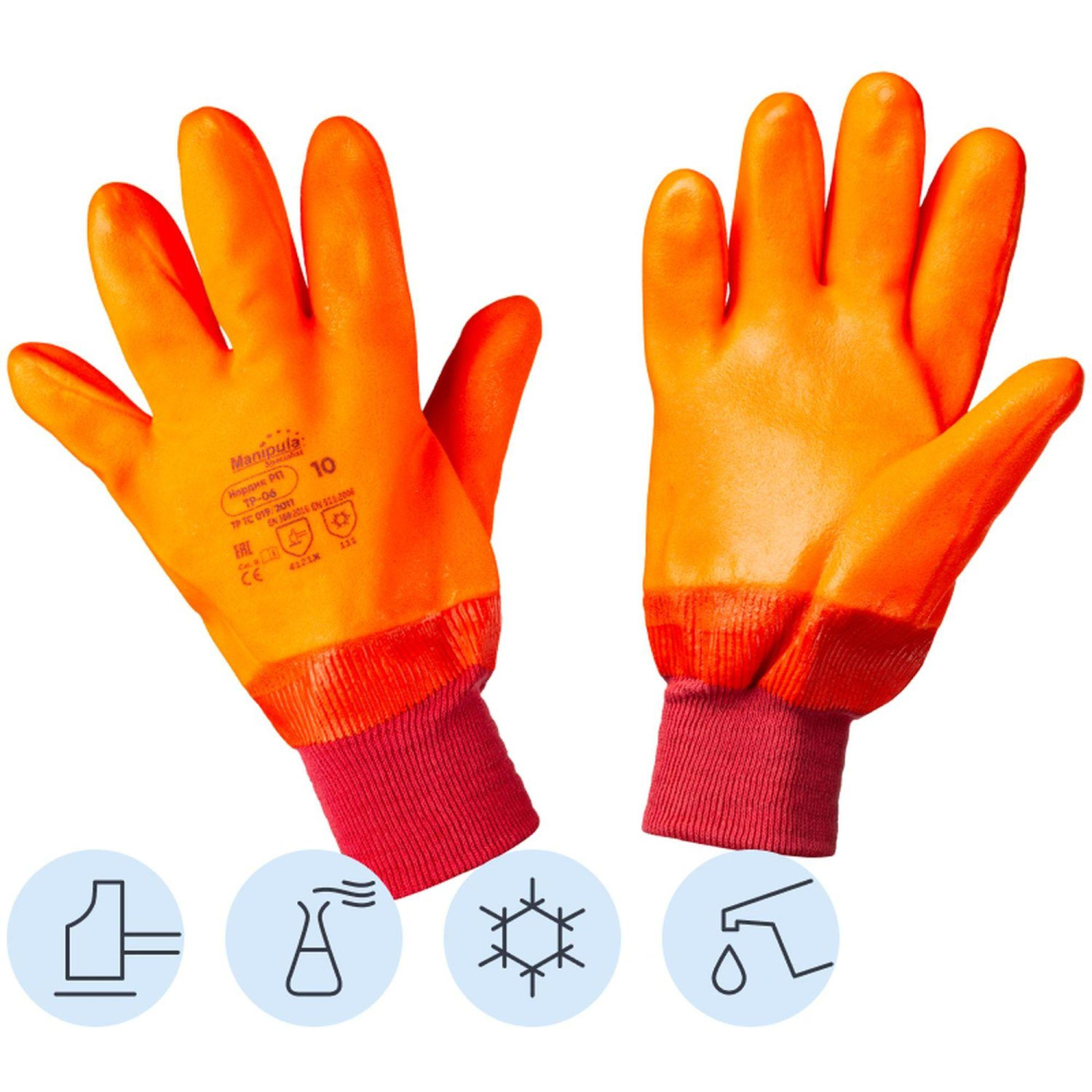 Перчатки рабочие утеплённые Manipula Specialist Нордик РП джерси с ПВХ покрытием оранжевые (размер 10, XL, ТР06/WG784)Перчатки защитные предназначены для защиты рук от кислот и щелочей, нефти и нефтепродуктов, механических воздействий и пониженных температур. Они представляют собой герметичные кроёные перчатки со сплошным покрытием из поливинилхлорида (ПВХ), что обеспечивает высокую стойкость к механическим нагрузкам и химическим воздействиям в условиях низких температур.Двухслойная хлопковая основа «джерси» гарантирует комфортное использование и эффективное абсорбирование влаги, а термоизоляционная прокладка из пенополиуретана обеспечивает надёжную защиту от холода и смягчает ударные нагрузки. Покрытие перчаток успешно прошло испытания на многократный изгиб при температуре −50°C. Рисунок рабочей поверхности в виде текстуры «песок» обеспечивает уверенный захват как в сухих, так и во влажных или масляных условиях.Особое внимание уделено безопасности: предохранительный манжет-крага защищает запястные вены от механических повреждений и позволяет мгновенно сбросить перчатку с руки без контакта с агрессивной средой. Для гигиеничности изделие прошло антибактериальную обработку Sanitized Actifresh®, предотвращающую возникновение микробной среды и неприятных запахов. Перчатки допускают неоднократную машинную стирку при температуре 40°C, что продлевает их срок службы.Модель рекомендована для использования в ЖКХ, строительстве, ремонте, логистике, складских работах и других сферах, где требуется защита от химических веществ, механических воздействий и низких температур. Она подходит для работы в сухих и влажных условиях, включая контакт с маслами. В упаковке содержится одна пара перчаток.Перчатки соответствуют стандартам ГОСТ EN ISO 21420-2020, ГОСТ 12.4.252-2013, ТР ТС 019/2011, ГОСТ EN 511-2006, ГОСТ EN 388-2016. Эксплуатационный уровень: EN388 — 4121B, EN 511 — 111. Расшифровка:— Стойкость к истиранию (кол-во циклов) — 4.— Стойкость к порезам (Испытание с применением дискового ножа/Индекс) — 1.— Сопротивление разрыву (в ньютонах) — 2.— Сопротивление проколу (в ньютонах) — 1.— Стойкость к порезам по стандарту EN ISO (5 ньютонов) — B.— Конвективный холод — 1.— Контактный холод — 1.— Водонепроницаемость — 1.Внешний вид и/или характеристики товара могут быть изменены производителем в соответствии с производственным процессом.