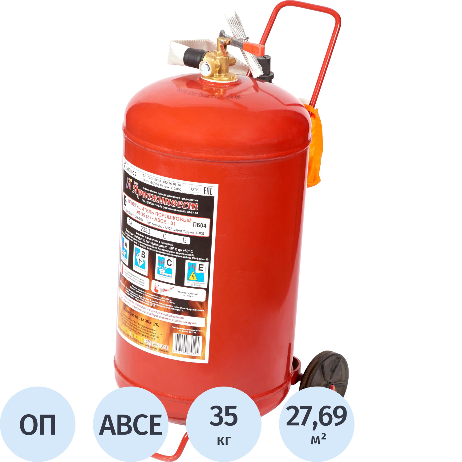 Огнетушитель передвижной порошковый ОП-35(з) АВСЕ предназначен для защиты производственных и хозяйственных помещений. Он подходит для использования на автомобильном, железнодорожном, речном транспорте и морских судах. Данный огнетушитель эффективно тушит пожары классов А (твердые вещества), В (жидкие вещества), С (газообразные вещества) и электроустановки под напряжением до 1000 В. Рекомендуемый температурный диапазон эксплуатации составляет от −50°С до 50°С.Огнетушитель обладает конструкцией, включающей корпус с огнетушащим веществом. На горловине находится запорно-пусковое устройство с индикатором давления и ручкой для управления подачей порошка. Для удобства транспортировки предусмотрена дополнительная ручка. Устройство оборудовано рукавом с распылителем, что позволяет получать факел распыла порошка. Огнетушитель оснащен чекой для предотвращения самосрабатывания.Функциональные особенности: — Ранг: 6А 233В СЕ. — Вес огнетушителя: 49,79 кг. — Масса огнетушащего порошка: 35 кг. — Время подачи огнетушащего вещества: 20 сек. - Площадь тушения: 27,70 кв.м. — Диаметр баллона: 31,5 см.Огнетушитель соответствует стандарту ГОСТ Р 51057-2001 и требованиям ТР ЕАЭС 043/2017. Гарантийный срок составляет 18 месяцев.