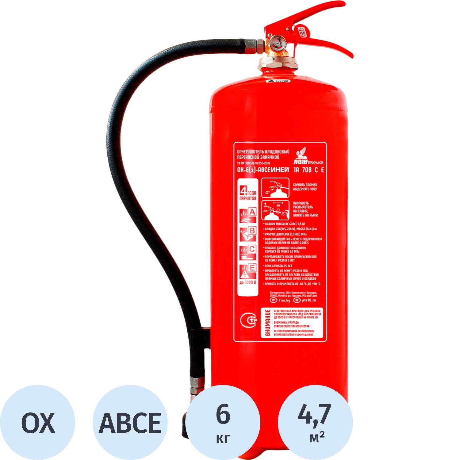 Огнетушитель хладоновый ОХ-6(з) АВСЕ «Иней» 1А, 70 В С Е предназначен для тушения всех классов пожаров. Он эффективно используется в офисах, жилых помещениях, кухнях, гаражах, а также в специализированных областях, таких как электроника и авиационная промышленность. Рекомендуемый температурный диапазон использования составляет от −50°C до 50°C.Огнетушитель имеет компактный и удобный дизайн. Баллон выполнен из прочного материала, что обеспечивает надежность и долгий срок службы. Он сертифицирован на соответствие требованиям Технического Регламента ТР ТС 032/2013.Функциональные особенности: — Ранг огнетушителя: 1А 70В СЕ. — Вес огнетушителя: 9,5 кг. — Масса огнетушащего порошка: 6 кг. — Время подачи огнетушащего вещества: 10 секунд. — Площадь тушения: 4,7 кв.м. — Длина струи: 2 м. — Диаметр баллона: 18 см. — Гарантийный срок: 48 месяцев.Основное преимущество хладоновых огнетушителей заключается в том, что они тушат возгорания без ущерба для защищаемого имущества. Используемый газ является безопасным, не токсичным, не электропроводным и не вызывает коррозии. Благодаря этим свойствам огнетушитель широко применяется для защиты компьютерных помещений, музеев, лабораторий и специальной техники.Огнетушитель способен подавать струю огнетушащего состава на расстояние не менее 2 метров. Он эффективно тушит твердые горючие вещества и применяется в различных условиях, включая автомобили и жилые помещения.Огнетушитель соответствует стандартам ГОСТ Р 51057-2001 и НПБ 155-2002. Комплектация: огнетушитель, шланг с распылителем, руководство по эксплуатации, объединенное с паспортом на огнетушитель. Паспорт баллона нанесен заводским клеймением по ТР ЕАЭС 032/2013. Производитель: Пожтехника, Беларусь. Срок службы огнетушителя составляет 15 лет.