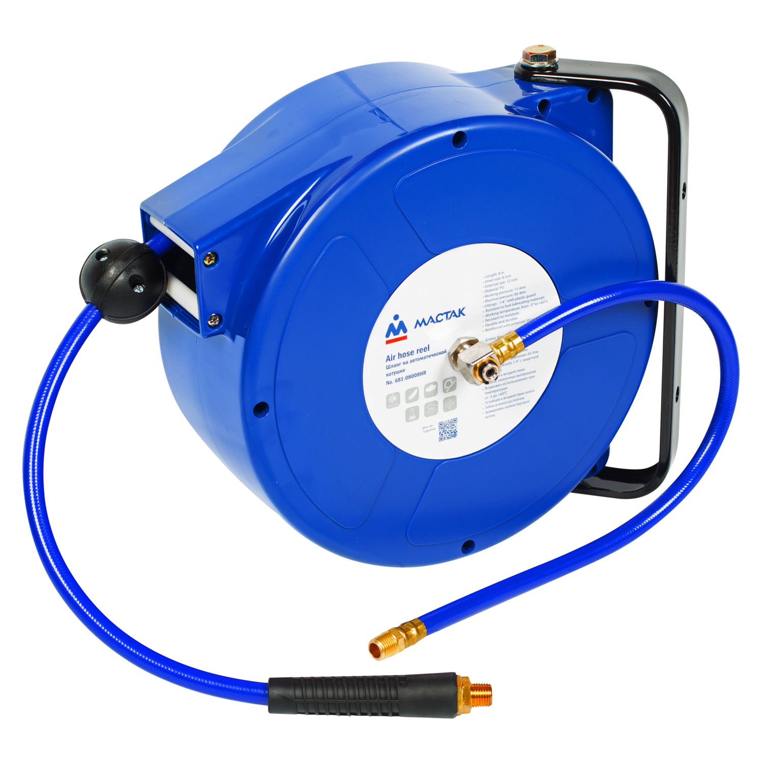 Шланг пневматический 8х12 мм, 8 м, на автоматической катушке, полиуретановый, резьба 1/4" МАСТАК 681-08008HR