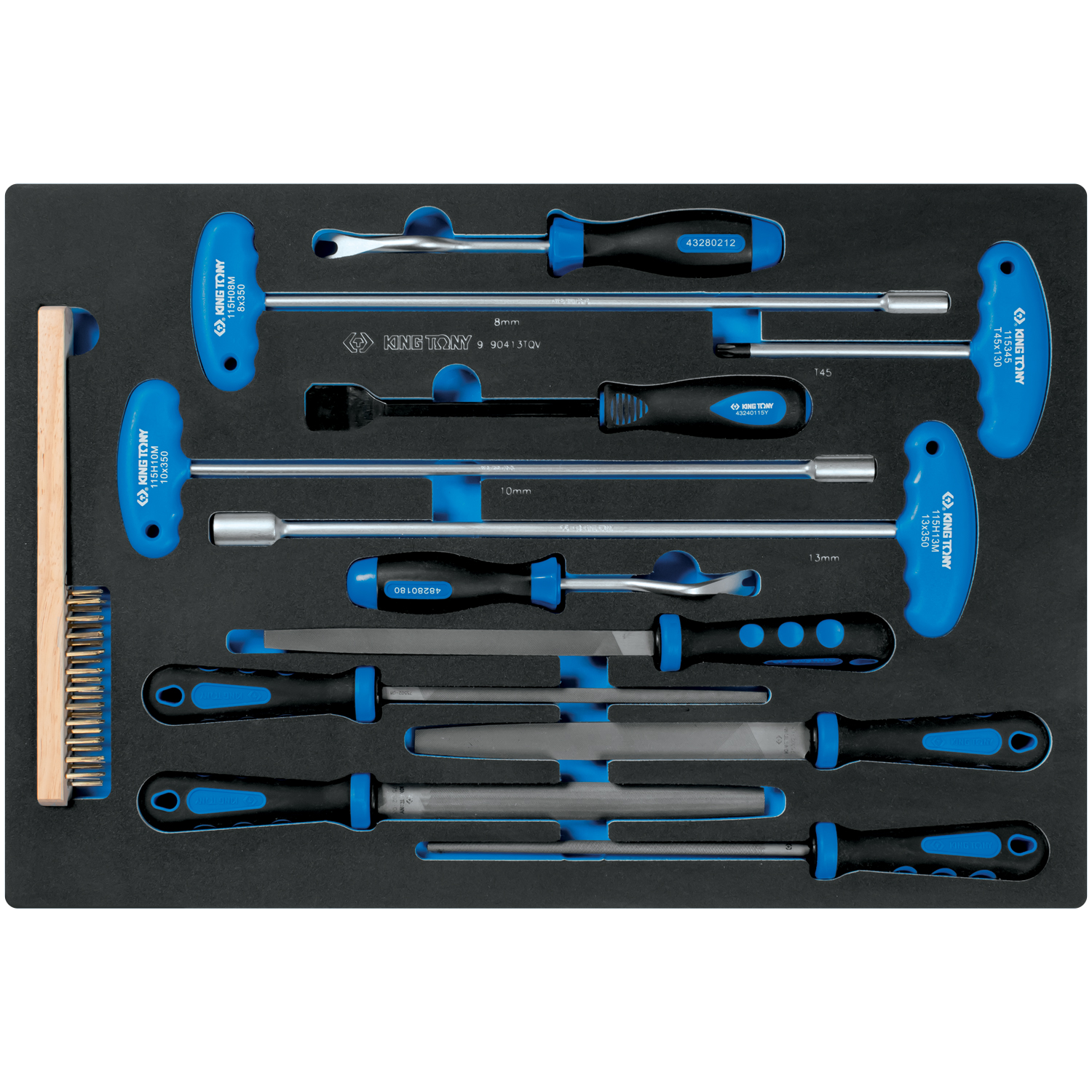 Набор напильников, ключей торцевых Т-типа, съемники клипс и металлическая щетка, ложемент, 13 предметов KING TONY 9-90413TQV