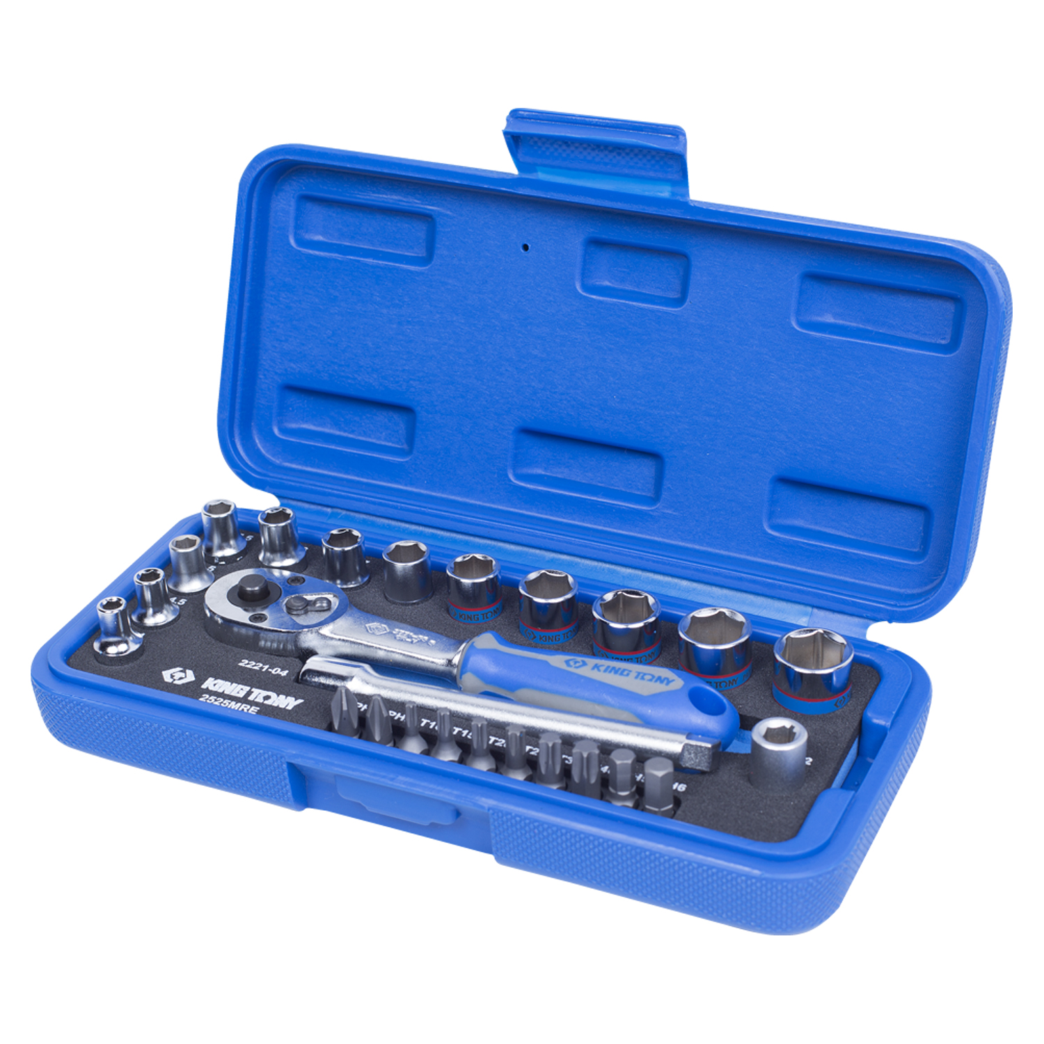 Набор торцевых головок с принадлежностями 1/4", шестигранные, 4-13 мм, 25 предметов KING TONY 2525MRE